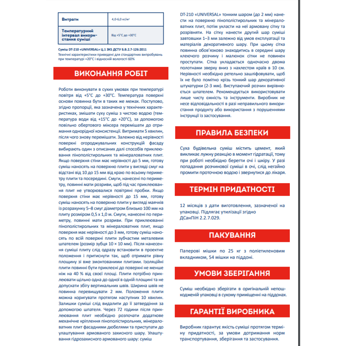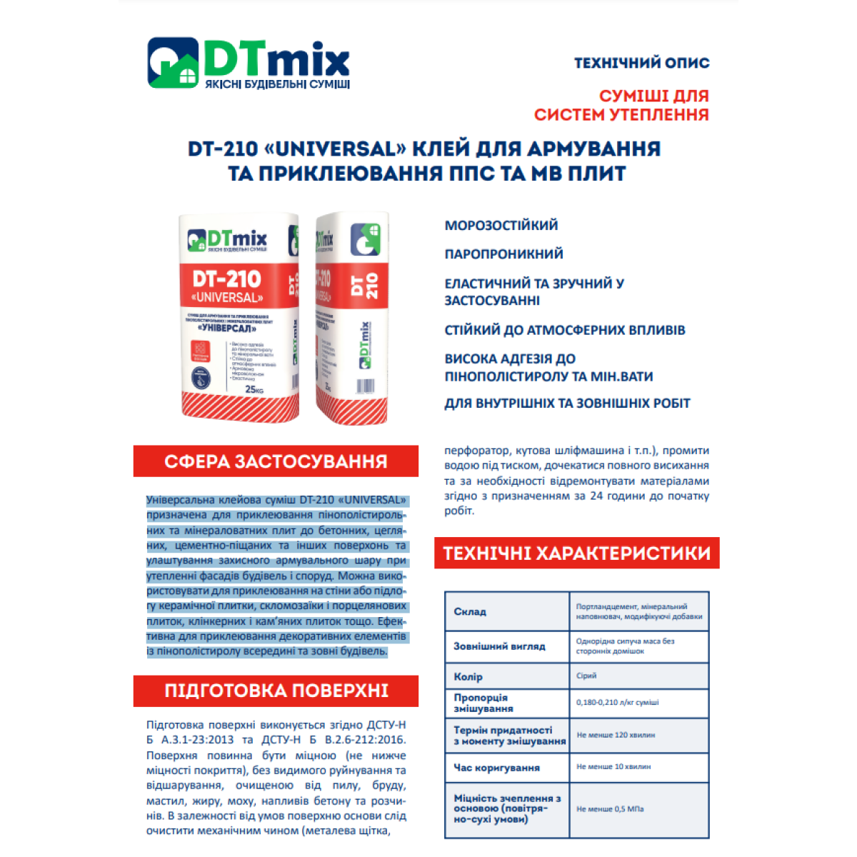 Клей для армування та приклеювання ППС та МВ плит DTmix DT-210 «UNIVERSAL»