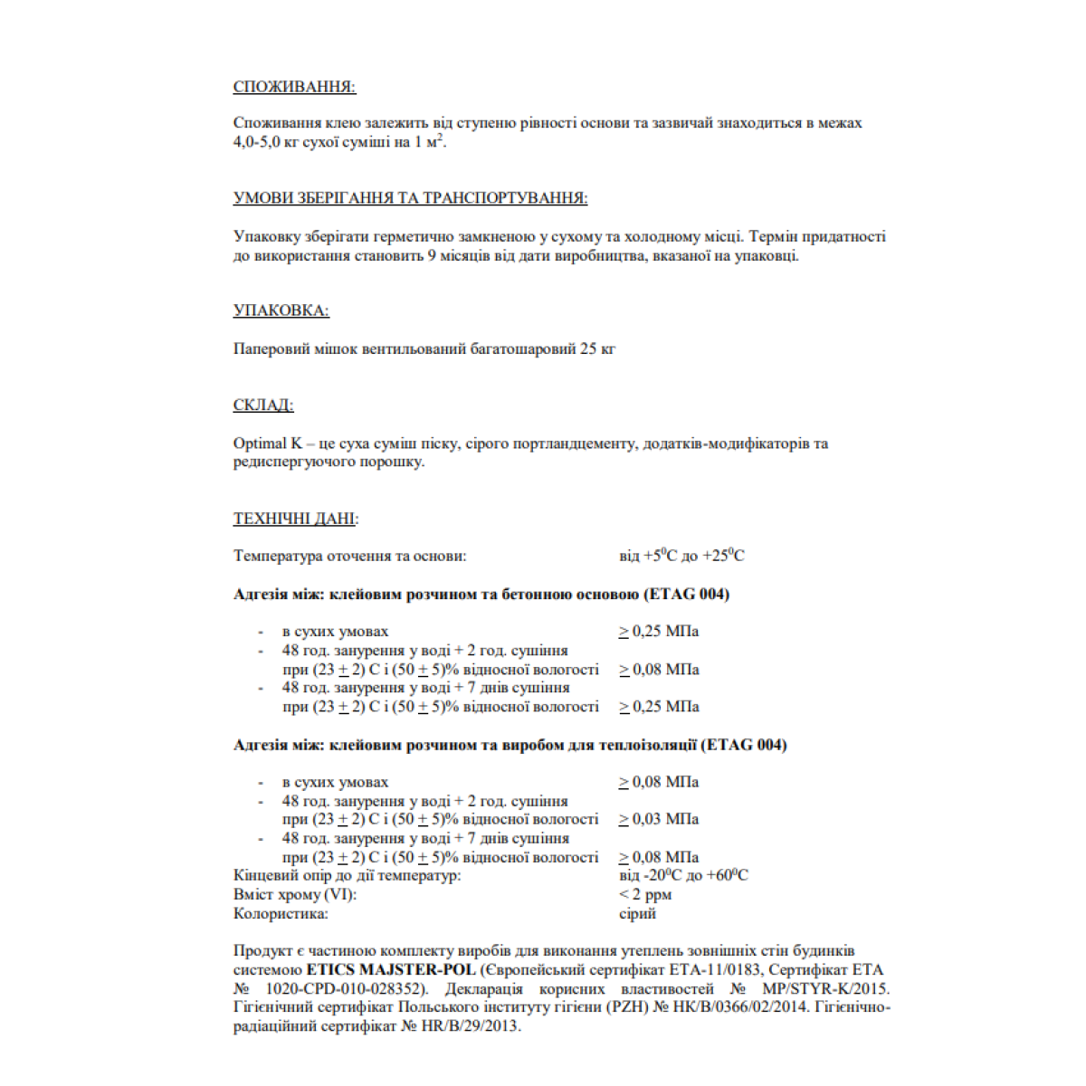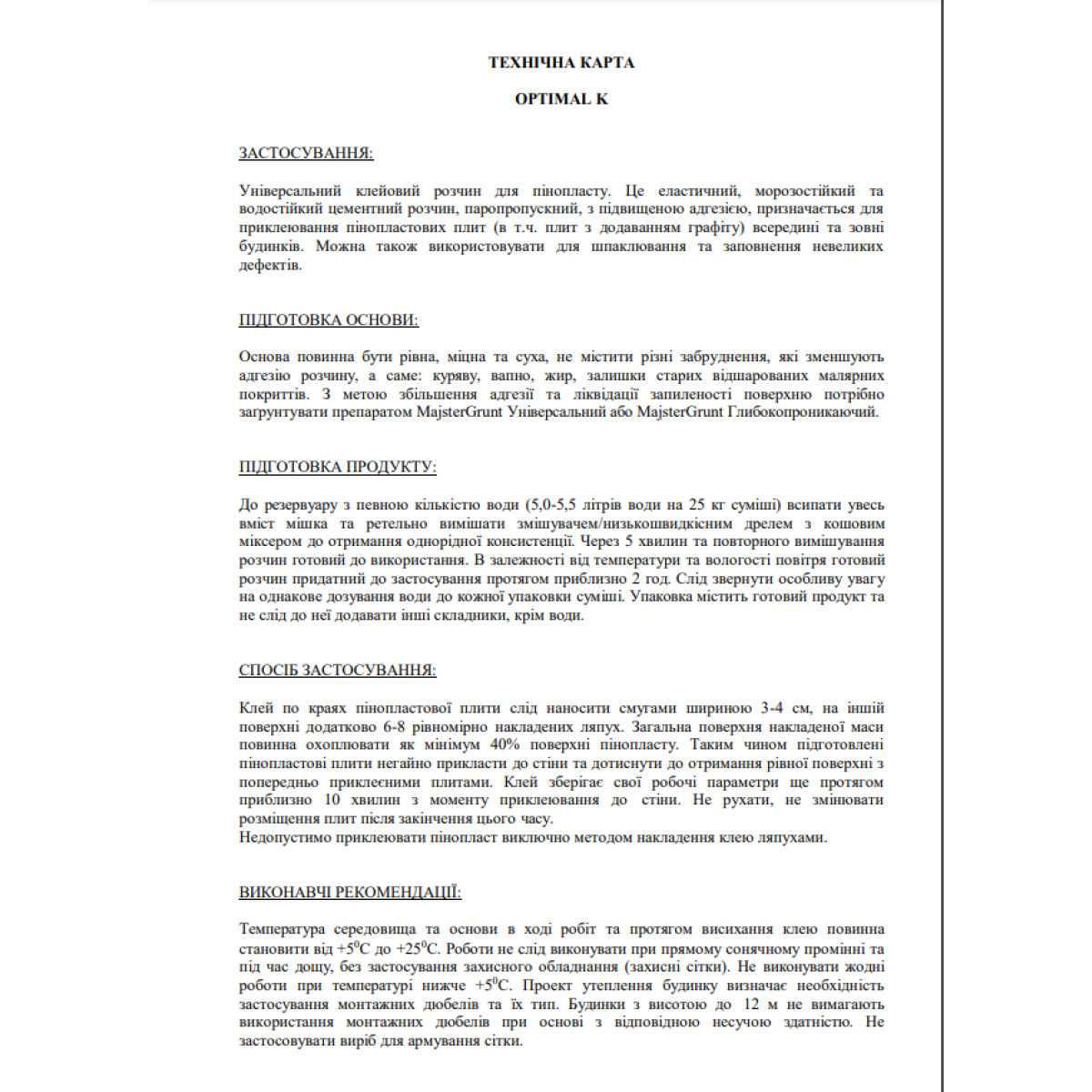 Optimal К – універсальний розчин клею для пінопласту. Він є гнучким, морозостійким і водонепроникним розчином, з паропроникною підвищеною адгезією, призначений для приклеювання полістирольних панелей всередині і зовні будинків. Може використовуватися для наповнення малих порожнин.