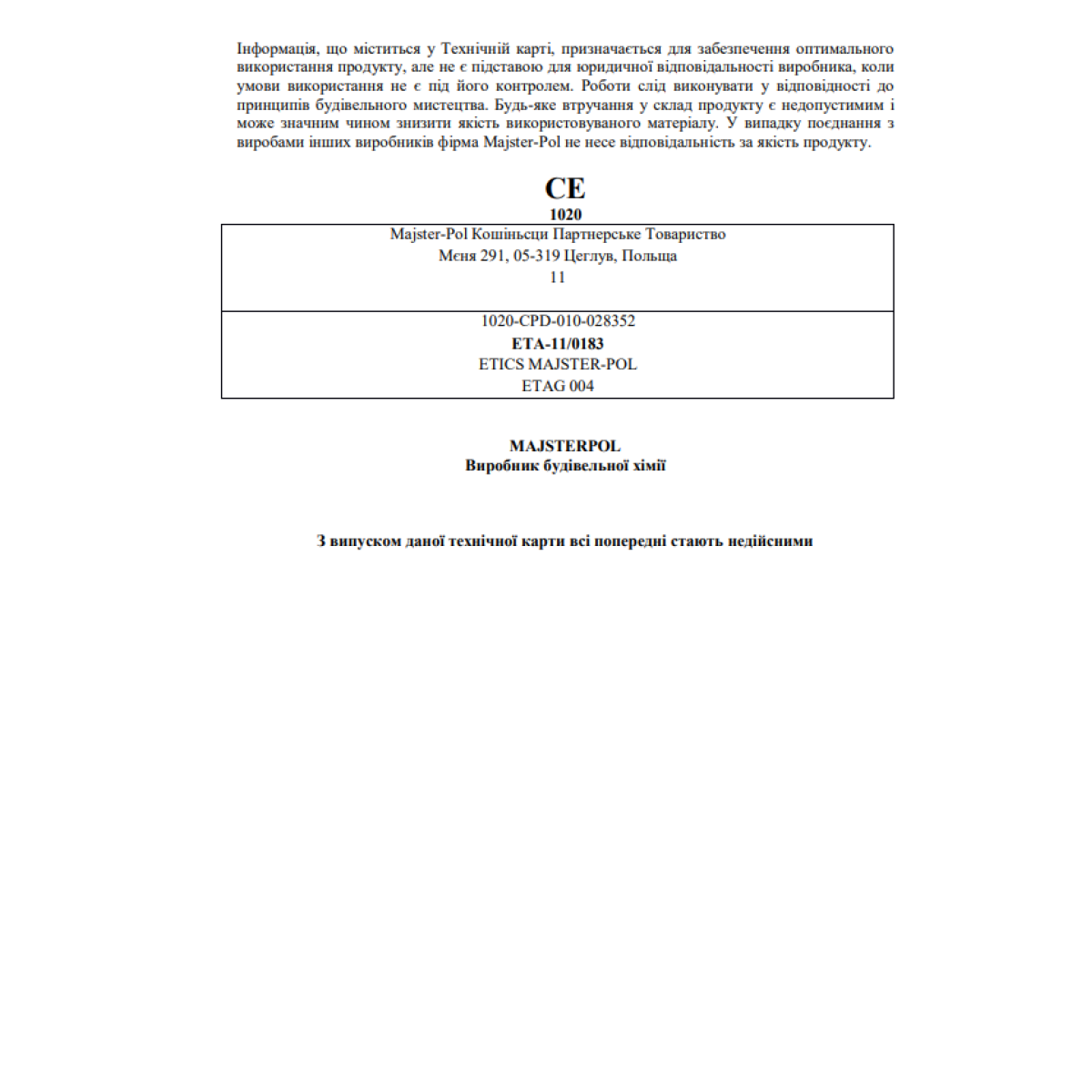 СПОСІБ ЗАСТОСУВАННЯ: Клей по краях пінопластової плити слід наносити смугами шириною 3-4 см, на іншій поверхні додатково 6-8 рівномірно накладених ляпух. Загальна поверхня накладеної маси повинна охоплювати як мінімум 40% поверхні пінопласту. Таким чином підготовлені пінопластові плити негайно прикласти до стіни та дотиснути до отримання рівної поверхні з попередньо приклеєними плитами. Клей зберігає свої робочі параметри ще протягом приблизно 10 хвилин з моменту приклеювання до стіни. Не рухати, не змінювати розміщення плит після закінчення цього часу. Недопустимо приклеювати пінопласт виключно методом накладення клею ляпухами.