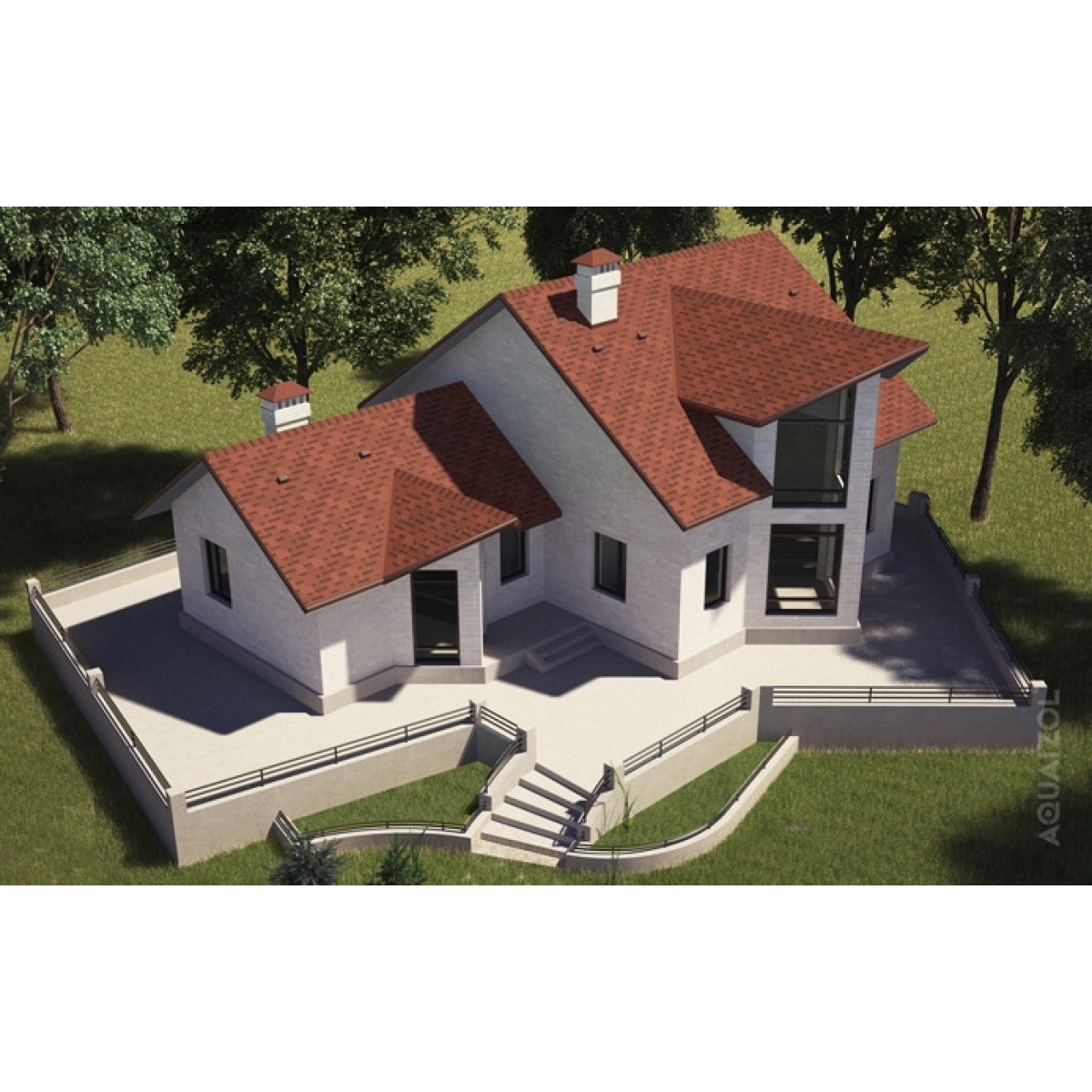 М“яка покрівля серії «Акцент» бренду Aquaizol – це плитки розміром 320х1000 мм, що мають складну конфігурацію з прямокутником в основі та трьома виступами прямокутної форми різної ширини. Виступи розташовані асиметрично вздовж довгої сторони основного прямокутника.