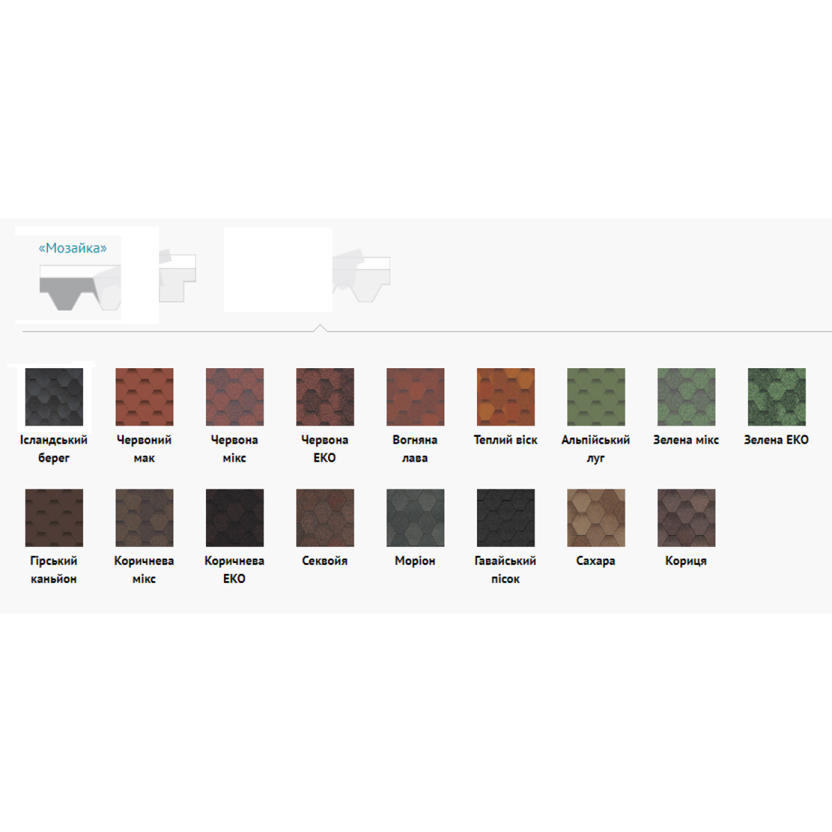 Гнучка черепиця мозаїка випускається у 12 варіантах забарвлення, кожен з яких – це комбінація з 2-3 кольорів, де переважає червоний, коричневий, чорний, сірий, зелений колір, антик та охра.
