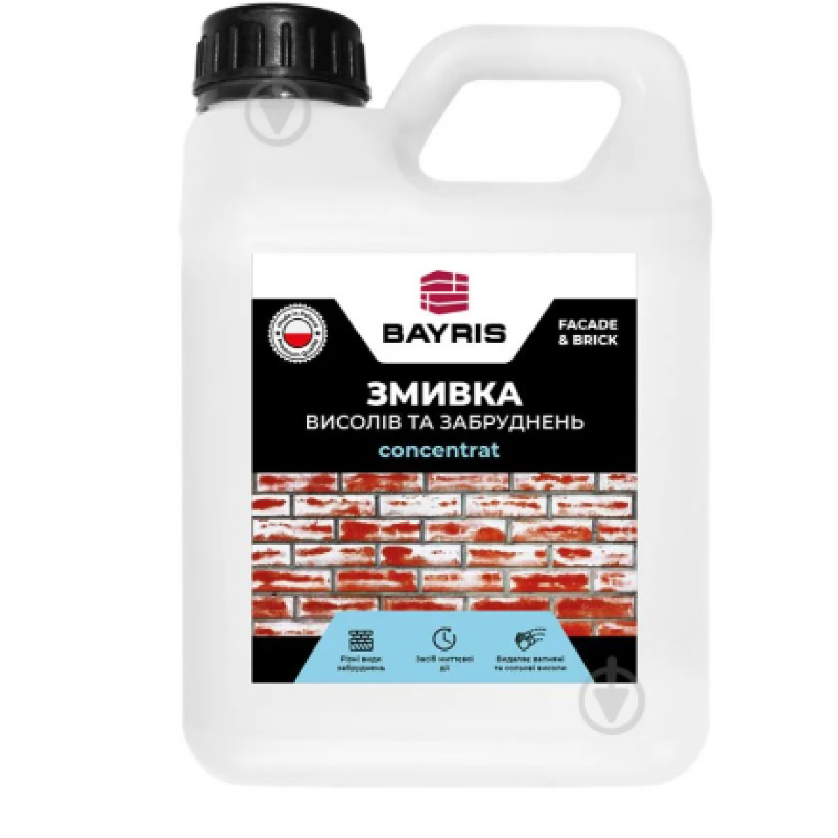 Змивка висолів та забруднень Bayris Concentrat - це високоефективний засіб, призначений для швидкого та ефективного видалення висолів та бруду з фасадів і інших поверхонь, виготовлених з керамічної плитки, цегли, природного та штучного каменю, а також інших матеріалів, що стійкі до дії кислот. Продукт швидко та ефективно видаляє бруд, що виникає внаслідок щоденної експлуатації, спричиненої умовами навколишнього середовища (дією води, відкладення пилу та бруду, знебарвленням), а також залишками цементного розчину.