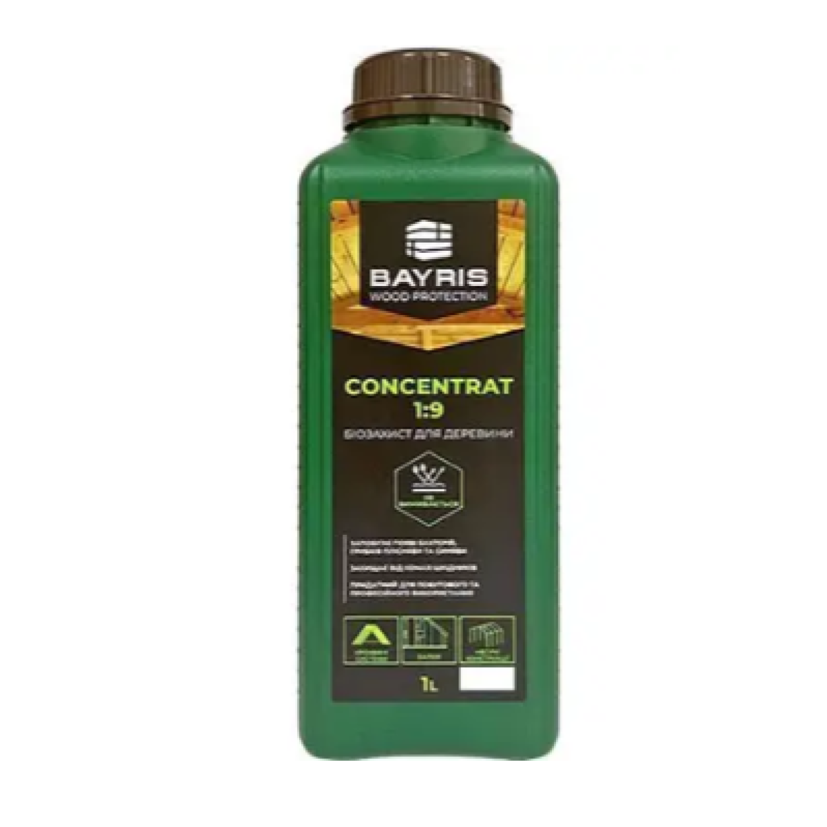 Біозахист для деревини Bayris Concentrat 1:9 1 л безбарвний призначений для захисту конструкційних дерев’яних елементів (горищних покриттів, каркасів, зрубів, кроквяних систем тощо) та будівельної деревини (підлоги, паркани, альтанки, терасні дошки, стовпи тощо) від біологічних уражень. Перешкоджає появі водоростей, лишайників, моху, грибків плісняви та синяви. Застосовується для захисту та профілактики від комах-шкідників. Придатний для побутового, професійного та промислового використання в умовах класів експлуатування 1-4.1 згідно з ДСТУ EN 335-1:2010 (клас використання залежить від методу нанесення).
