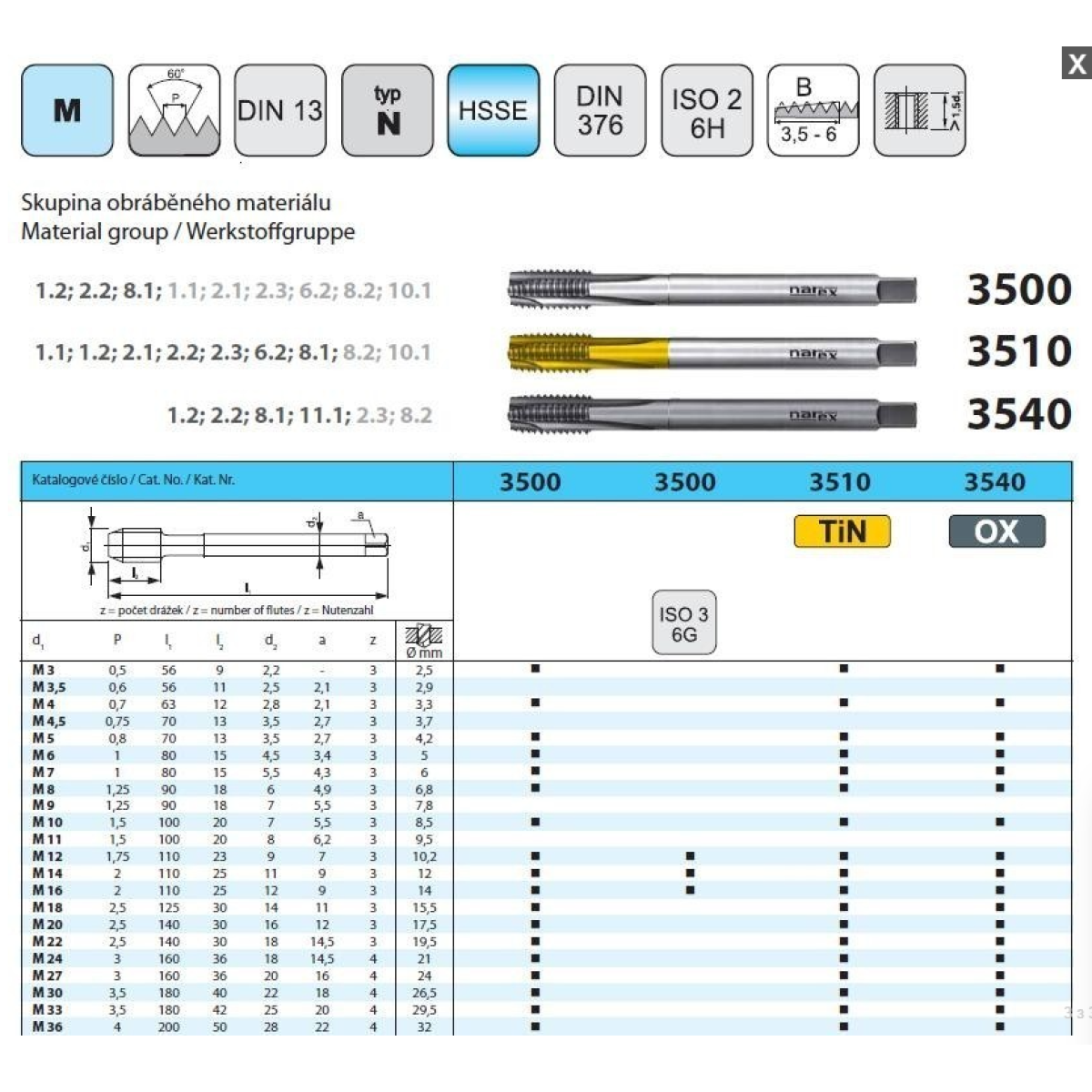 Мітчик машинний NAREX 3500 M22 HSSE ISO2 (6H) DIN376