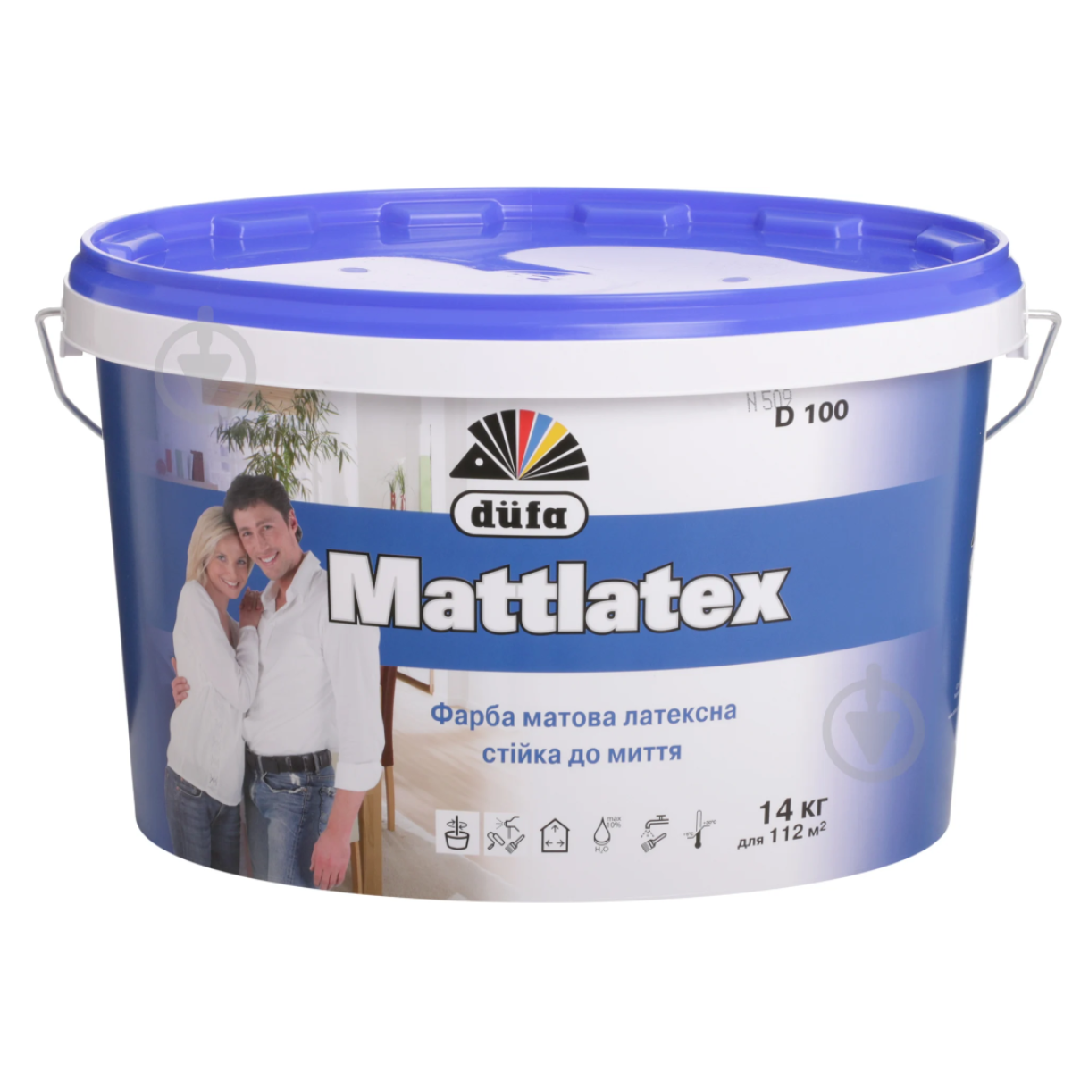 Dufa - Mattlatex D100 Латексна матова фарба призначена для фарбування штукатурки, бетону, цегли, гіпсових поверхонь, також ДВП, ДСП, фанери, дерева, склошпалер, шпалер, у тому числі з волокна “рауфазер“.