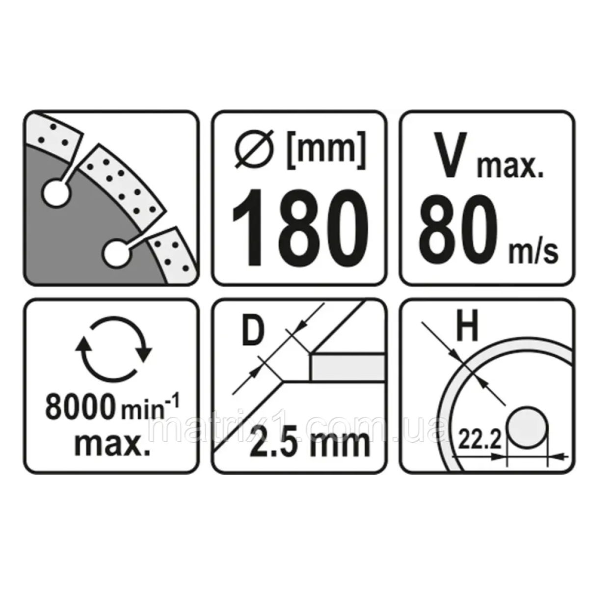 Диск алмазний сегментний 180 мм YATO YT-6004 призначений для точного і чистого різання таких матеріалів як бетон, камінь, цегла, асфальт, тощо . Диск може використовуватися для сухого або мокрого типу різання.