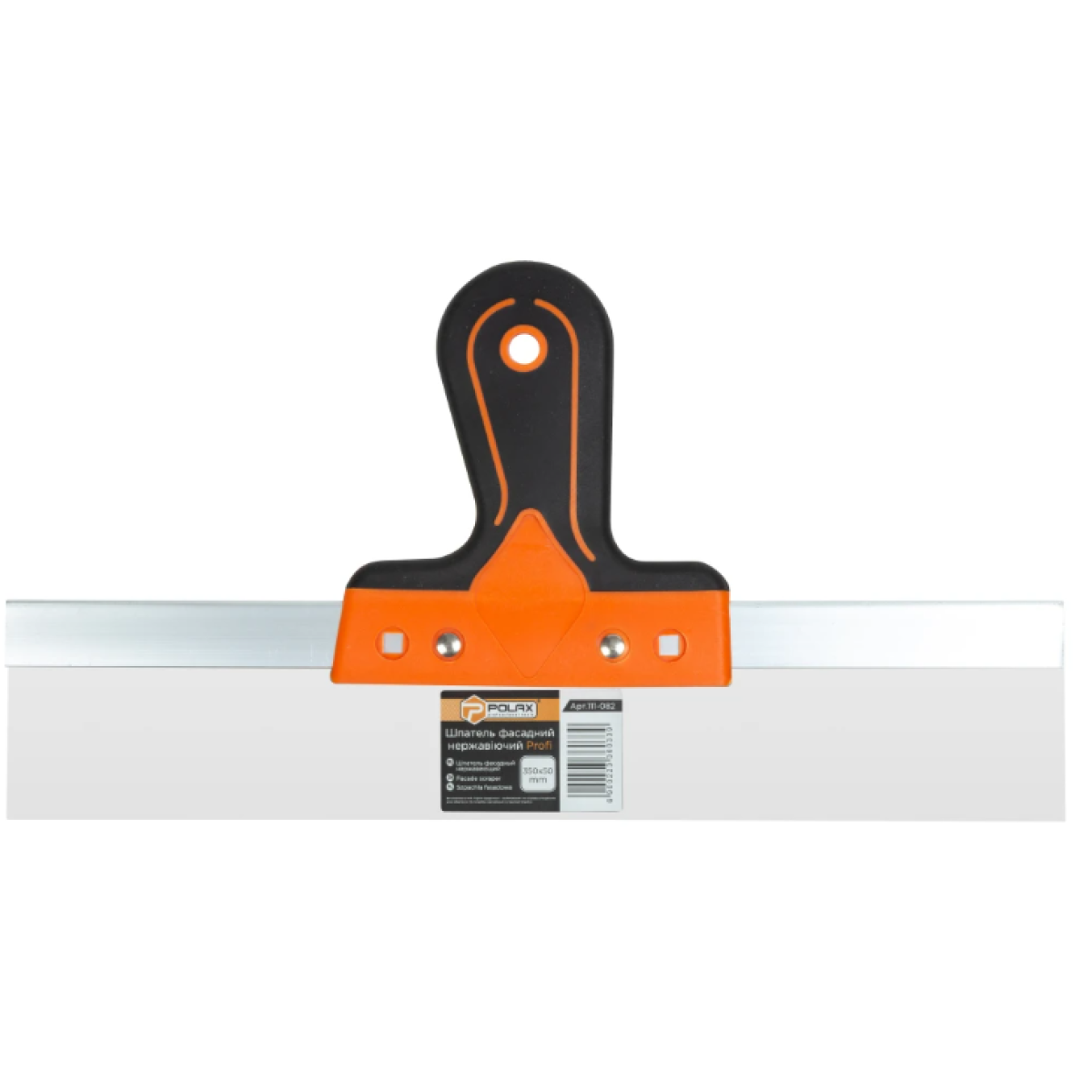 Професійний шпатель Polax з нержавіючим покриттям призначений для виконання різних робіт з оштукатурювання зовнішніх і внутрішніх поверхонь, а також для нанесення шпаклівок, мастик і клейових сумішей. Шпатель оснащений робочим полотном розміром 350 мм завширшки і 50 мм заввишки, що робить його універсальним інструментом для майстрів різного профілю.