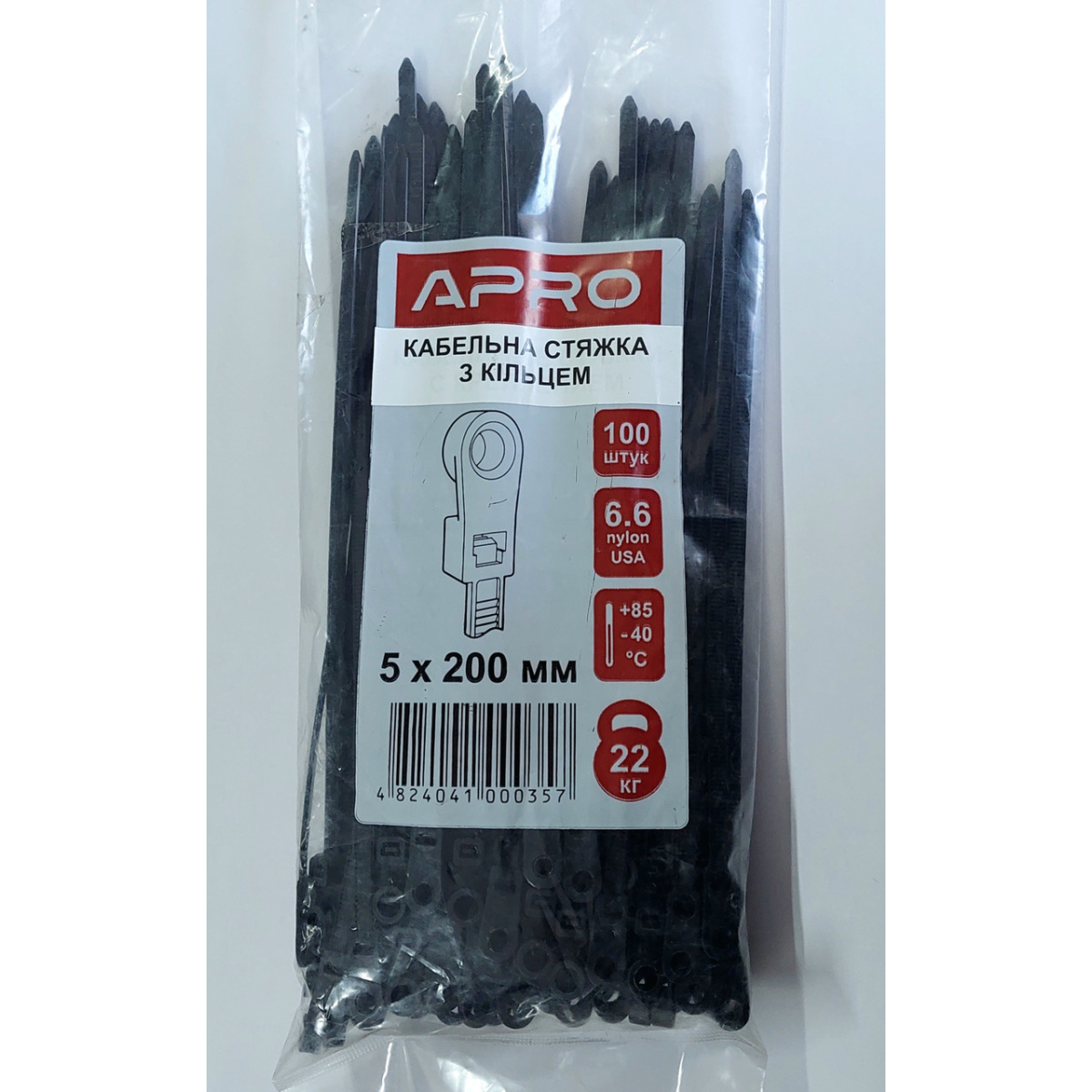 Стяжка нейлон 5х200 чорна з кільцем APRO уп. 100 шт.