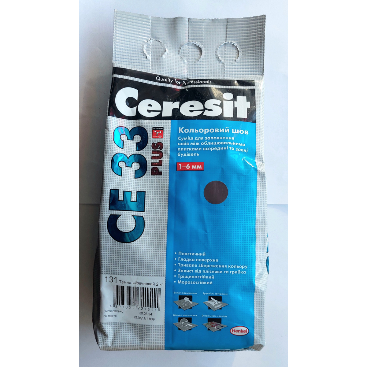 Полімерцементна суха суміш для заповнення швів між облицювальними плитками всередині та зовні будівель (ширина шва 1–6 мм) CERESIT® СЕ 33 PLUS — суміш для заповнення швів керамічних, скляних облицювальних плиток, а також облицювальних плиток зі штучного і натурального каменю, у тому числі мармуру, укладених на міцні, стійкі до деформації основи, на горизонтальних і вертикальних поверхнях усередині та зовні споруд, що експлуатуються у звичайному середовищі. Деформаційні шви в облицюваннях та місця примикання сантехнічного обладнання до облицювання необхідно заповнити герметиком Ceresit CS 25. Властивості пластичний морозостійкий тривале збереження кольору захист від плісняви та грибка гладка поверхня тріщиностійкий Підготовка основи для нанесення Ceresit СЕ 33 PLUS Шви мають бути очищені від пилу, бруду, клею та ін. речовин, які знижують адгезію. Ширина швів між плиткою повинна бути однаковою (використовуйте хрестиків для укладання плитки), а глибина заповнення швів – не меншою, ніж товщина плитки. Заповнення швів розпочинають лише після твердіння клейової суміші, на яку приклеєно облицювальну плитку. Приготування розчинової суміші Ceresit СЕ 33 PLUS В чисту ємність налити воду (t° від +15 °C до +20 °C) з розрахунку 0,31–0,33 л / 1 кг сухої суміші (1,55–1,65 л / 5 кг), поступово додати суху суміш і перемішати низькообер. міксером до отримання однорідної маси без грудок. Витримати ≈ 5 хв. і знову перемішати. Увага! Необхідно ретельне механічне перемішування. Застосувати протягом 60 хв. Нанесення Ceresit СЕ 33 PLUS Розчиновою сумішшю за допомогою гумового шпателя заповнити шов між плитками. Через ≈ 15 хв. надлишок матеріалу зібрати вологою губкою. Залишки суміші зібрати з поверхні та знову використати для заповнення швів. Через 5–10 хв. (за нормальних кліматичних умов ) розшиту поверхню облицювання промити вологою губкою, яку необхідно часто промивати у воді.