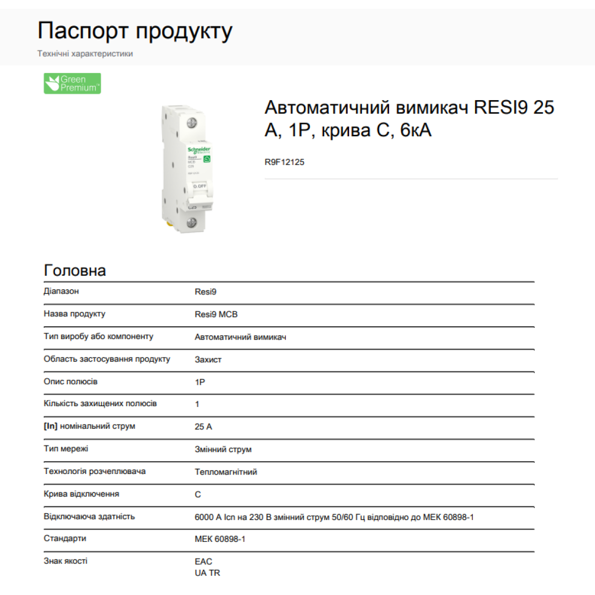 Автоматичний вимикач 6kA 1P 25A тип C, Resi9 Schneider Electric