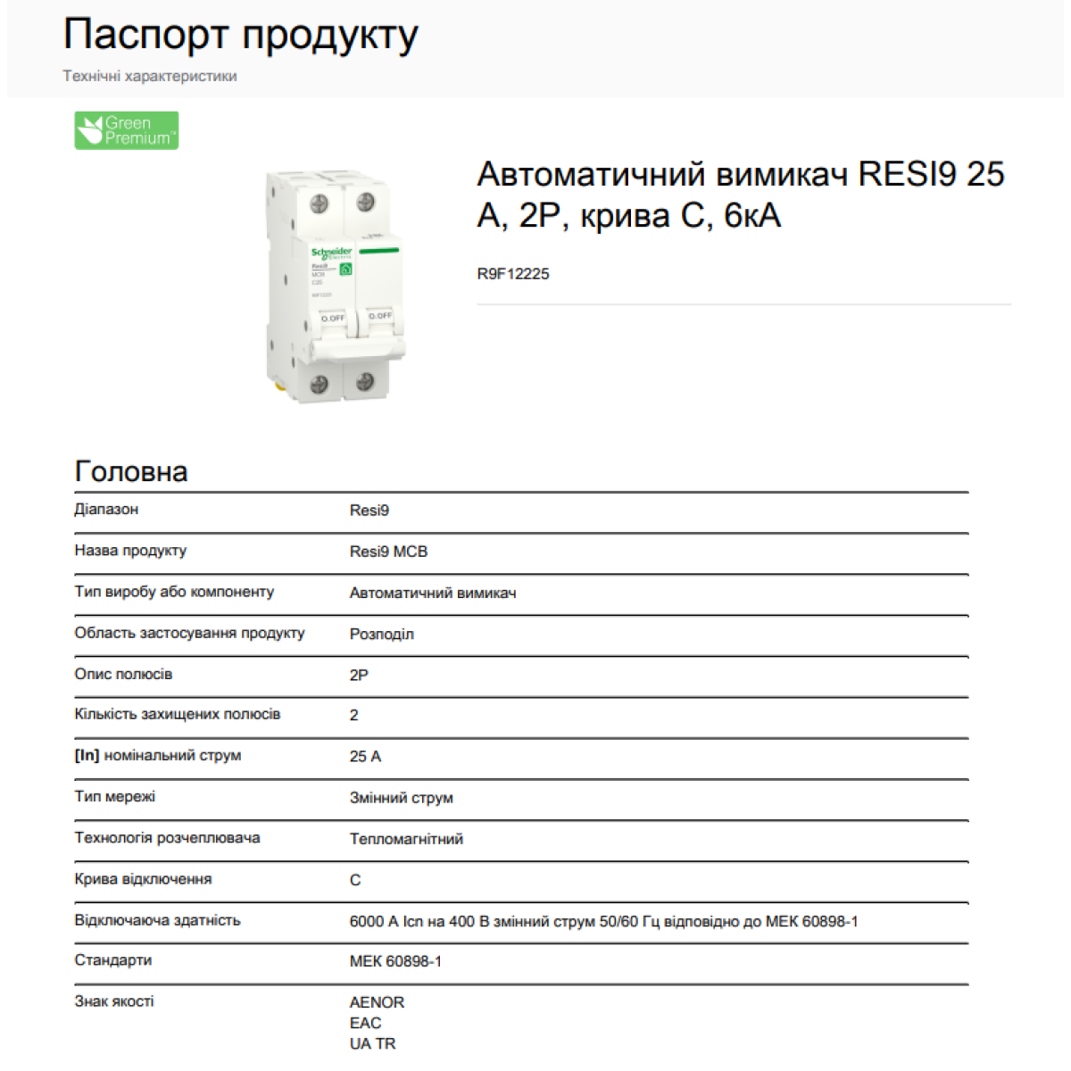 Автоматичний вимикач 6kA 2P 25A тип C, Resi9 Schneider Electric