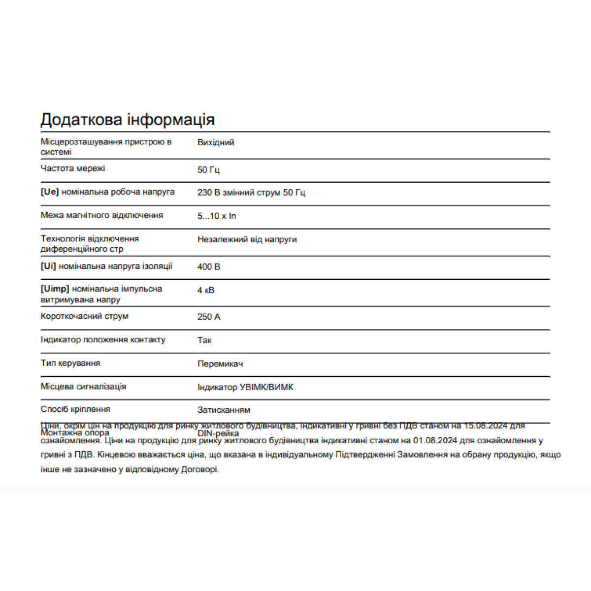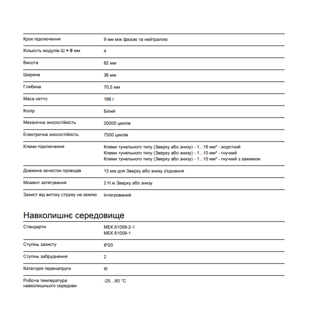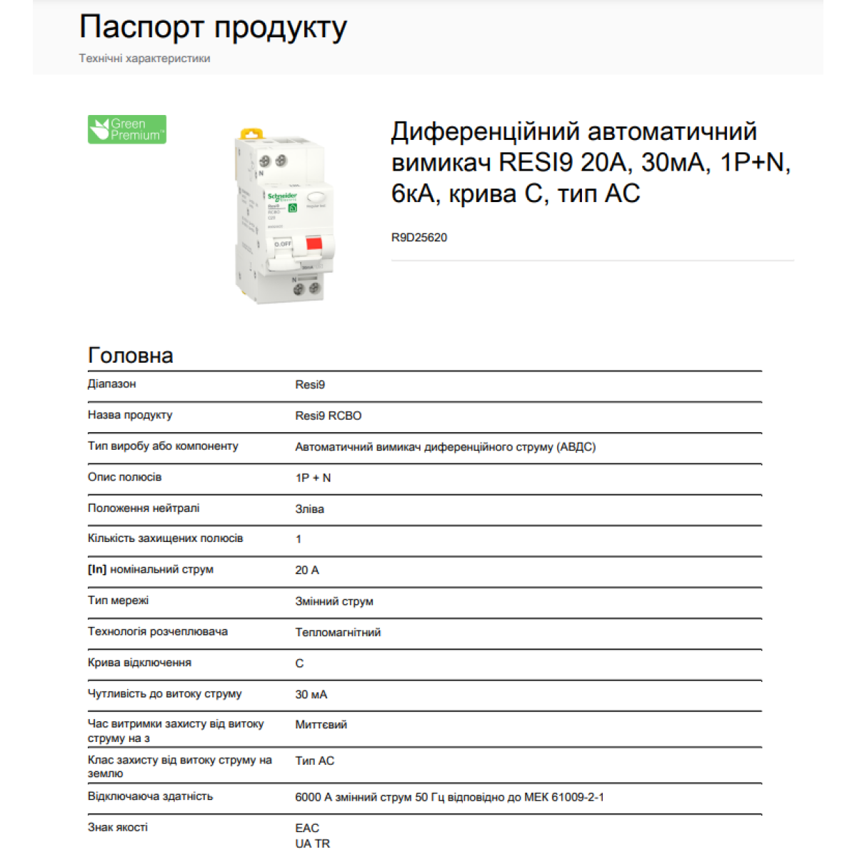 Диференційний автоматичний вимикач Resi9. Автоматичний вимикач 1P+N з 1 захищеним полюсом та номінальним струмом 20A, кривою відключення C. Клас захисту від витоку на землю - тип АС з чутливістю 30 мА. Миттєве спрацювання. Номінальна відключаюча здатність - 6000 А відповідно до стандарту EN/МЕК 61009-2-1. Цей продукт захищає від короткого замикання, перевантаження кабелю, ураження електричним струмом при непрямому контакті та небезпеці загоряння. Це безпечне, надійне рішення для комерційного та промислового використання з високою розривною здатністю. Цей продукт відповідає стандарту EN/МЕК 61009-2-1. Він має електричну витривалість до 7500 циклів і механічну витривалість до 20000 циклів. Робоча напруга Ue становить 230 В змінного струму. Його можна монтувати на DIN-рейку. The width in 9mm pitches is 4. Колір виробу білий (RAL9003). Розміри (Ш) 36 мм х (В) 82 мм х (Г) 70,5 мм. Вага 186 г. Він має ступінь захисту IP20 (відповідно до стандарту МЕК/EN 60529) та стає IP40 у модульному щиті. Робоча температура від -25°C до 60°C.