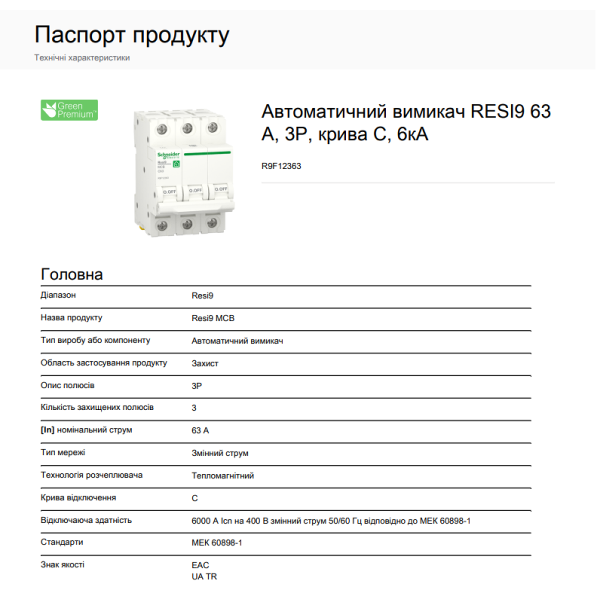 Автоматичний вимикач 6kA 3P 63A тип C, Resi9 Schneider Electric