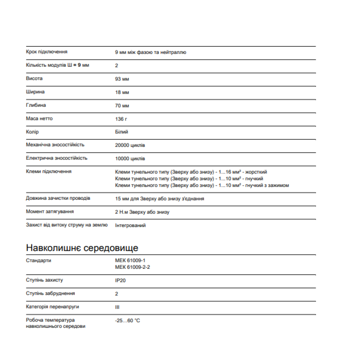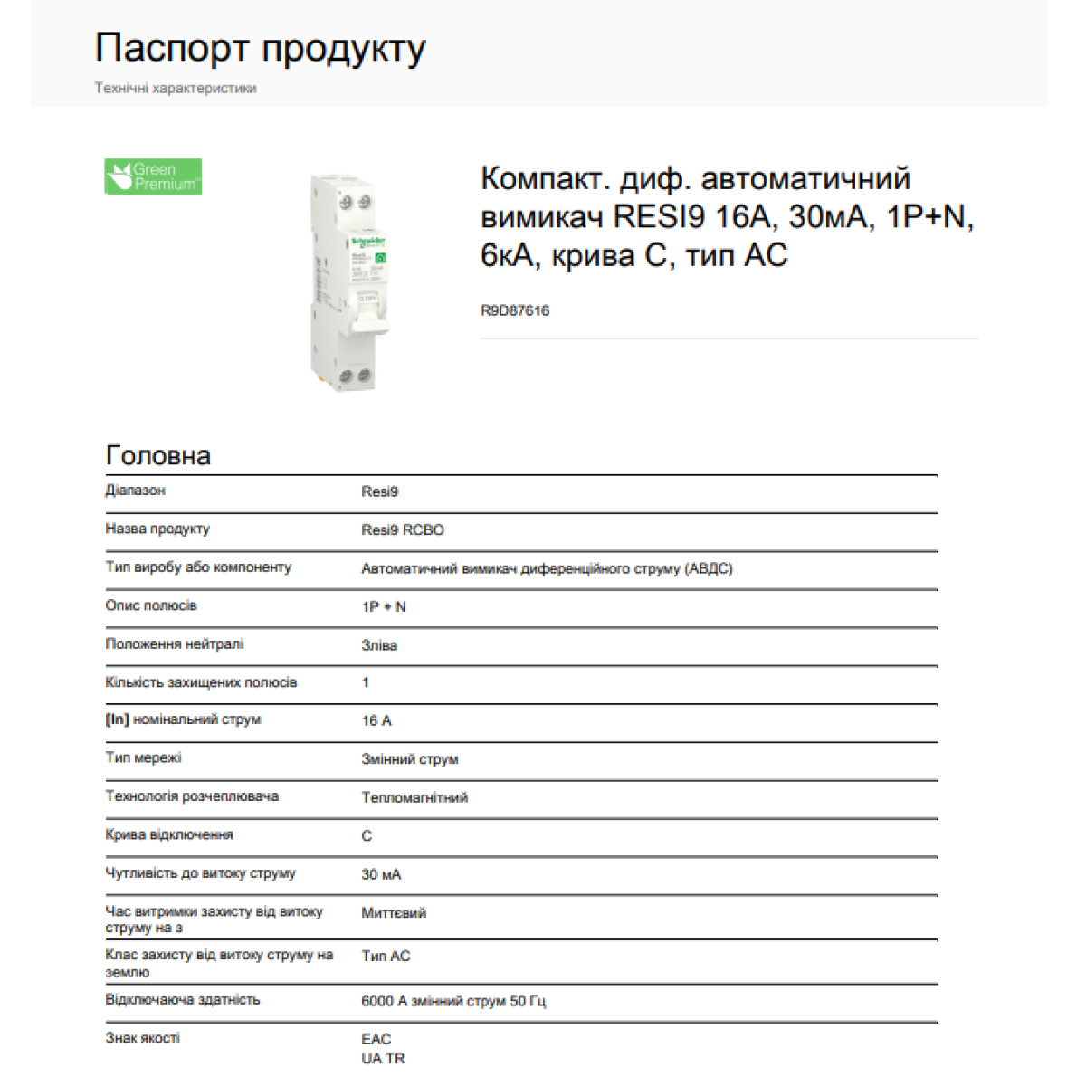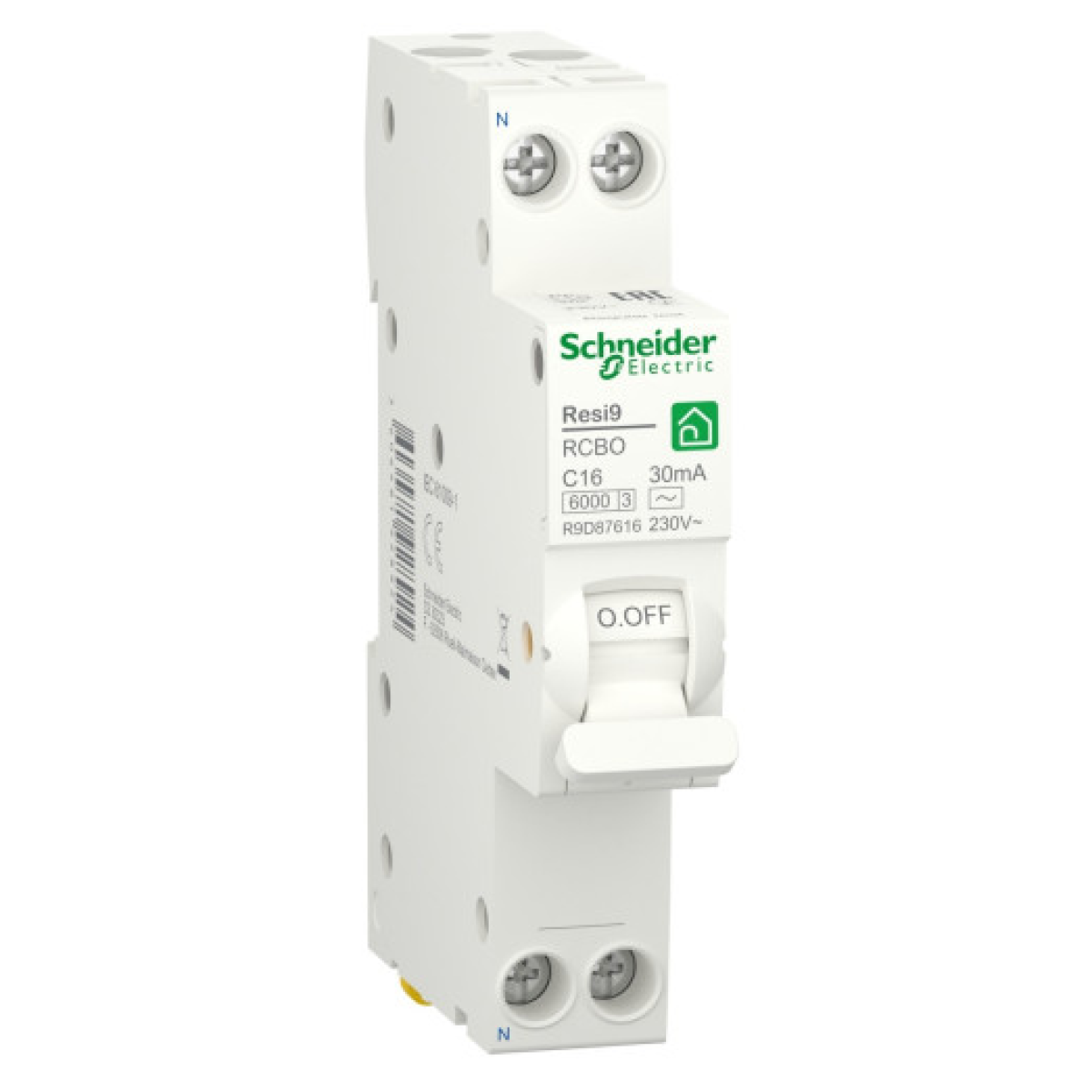 Диференційний автоматичний вимикач Resi9. Автоматичний вимикач 1P+N з 1 захищеним полюсом та номінальним струмом 16A, кривою відключення C. Клас захисту від витоку на землю - тип АС з чутливістю 30 мА. Миттєве спрацювання. Номінальна відключаюча здатність - 6000 А відповідно до стандарту EN/МЕК 61009-2-2. Цей продукт захищає від короткого замикання, перевантаження кабелю, ураження електричним струмом при непрямому контакті та небезпеці загоряння. Це безпечне, надійне рішення для комерційного та промислового використання з високою розривною здатністю. Цей продукт відповідає стандарту EN/IEC 61009-2-2. Він має електричну витривалість до 10000 циклів і механічну витривалість до 20000 циклів. Робоча напруга Ue становить 230 В змінного струму. Його можна монтувати на DIN-рейку. The width in 9mm pitches is 2. Колір виробу білий (RAL9003). Розміри (Ш) 18 мм х (В) 93 мм х (Г) 70 мм. Вага 136 г. Він має ступінь захисту IP20 (відповідно до стандарту МЕК/EN 60529) та стає IP40 у модульному щиті. Робоча температура від -25°C до 60°C.