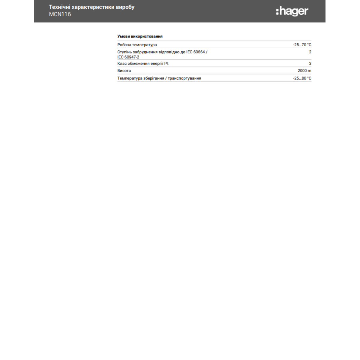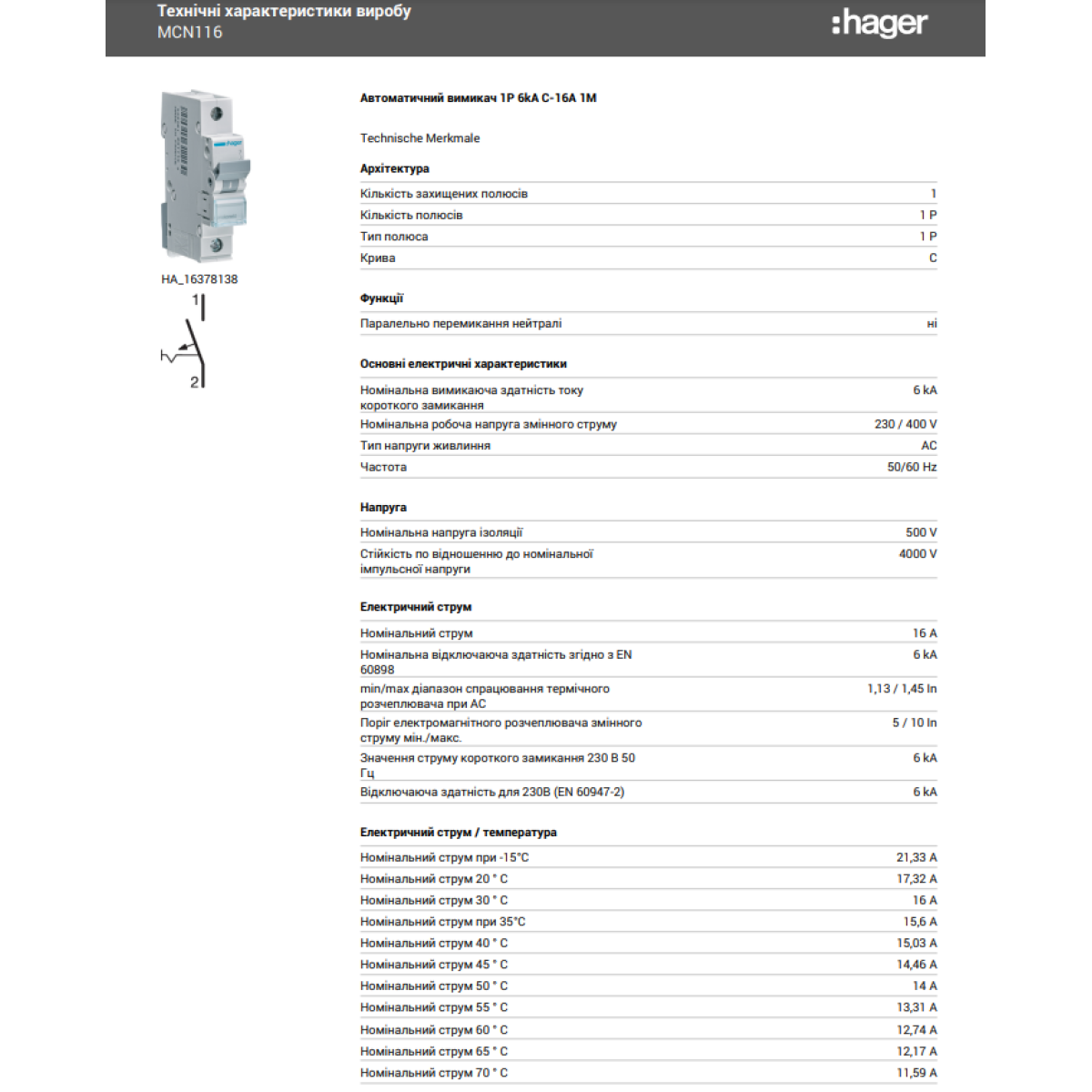 Автоматичний вимикач 6kA 1P 16A тип C, Hager MCN116