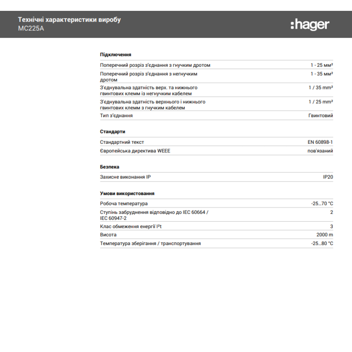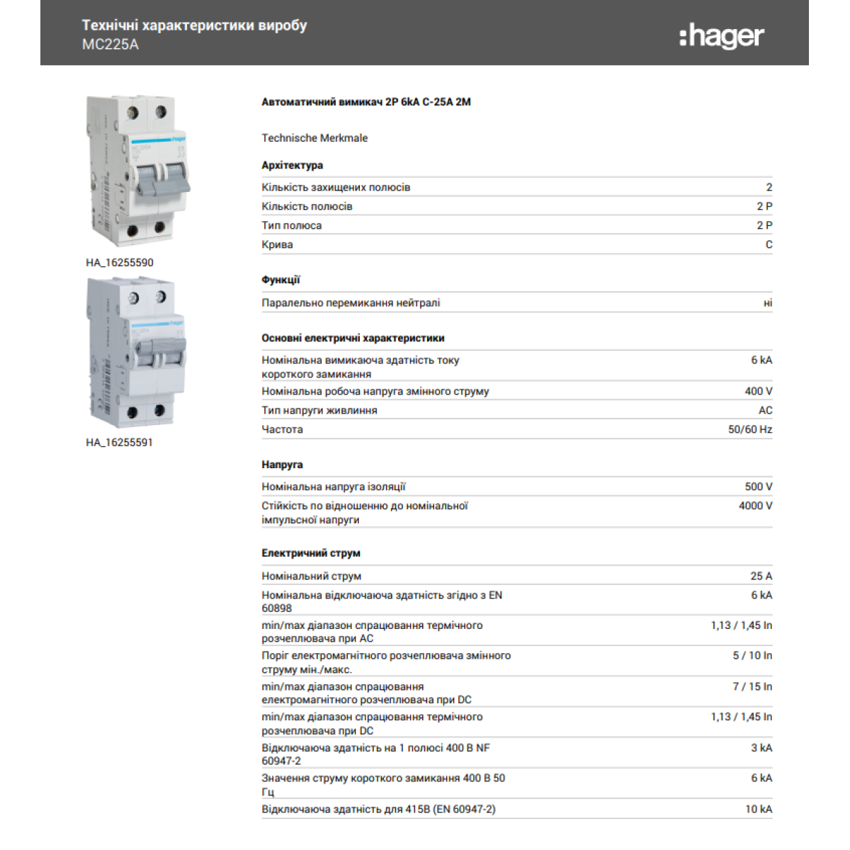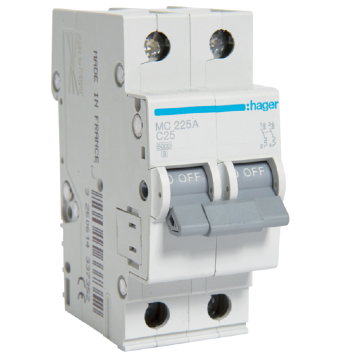 Автоматичний вимикач 6kA 2P 25A тип C, Hager MC225A