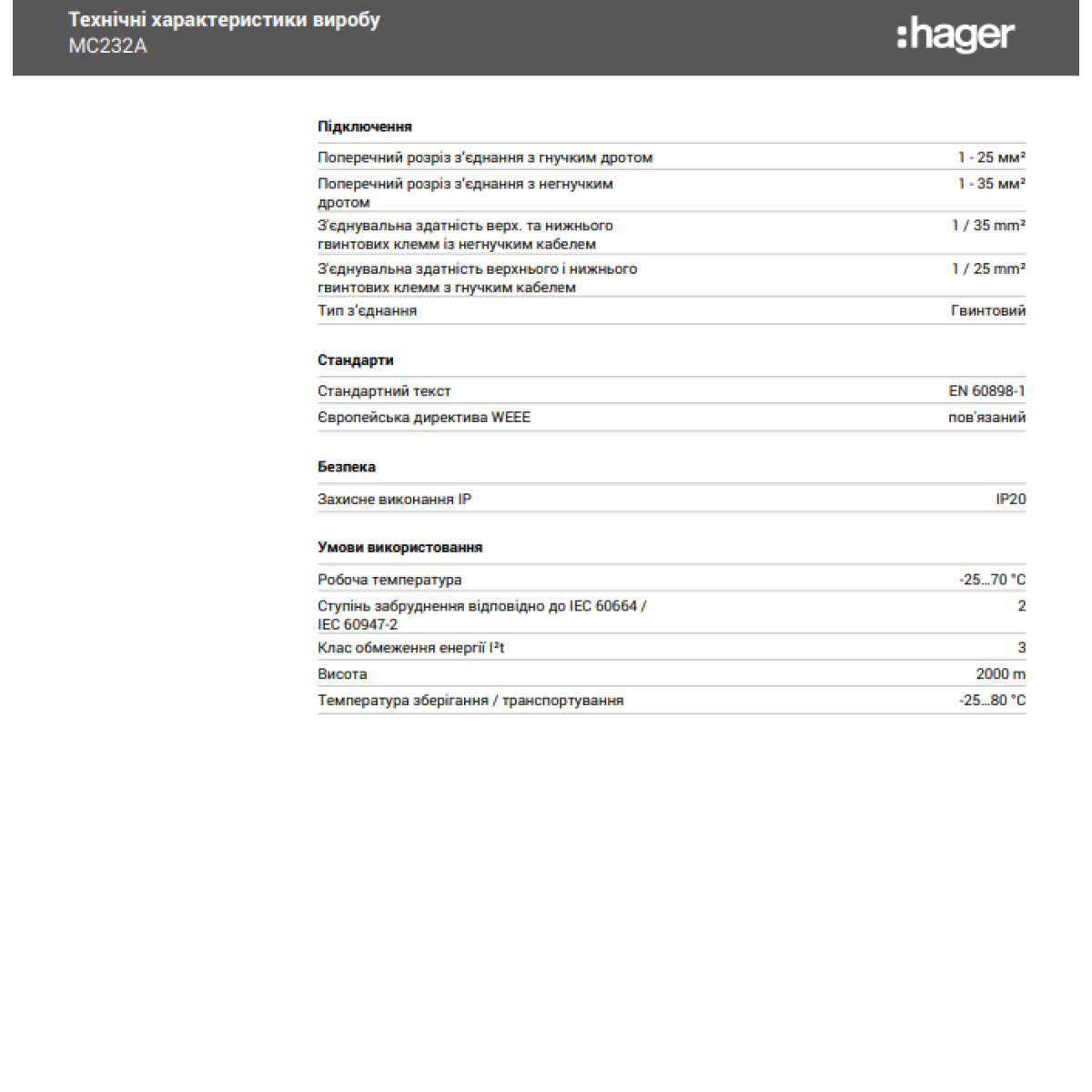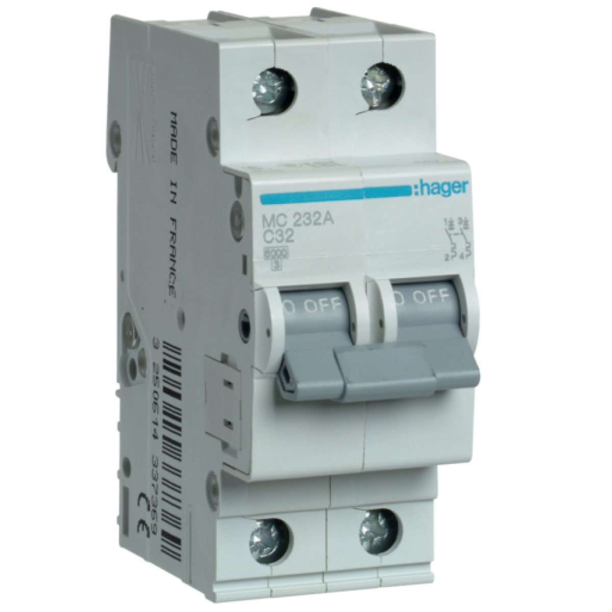Автоматичний вимикач 6kA 2P 32A тип C, Hager MC232A