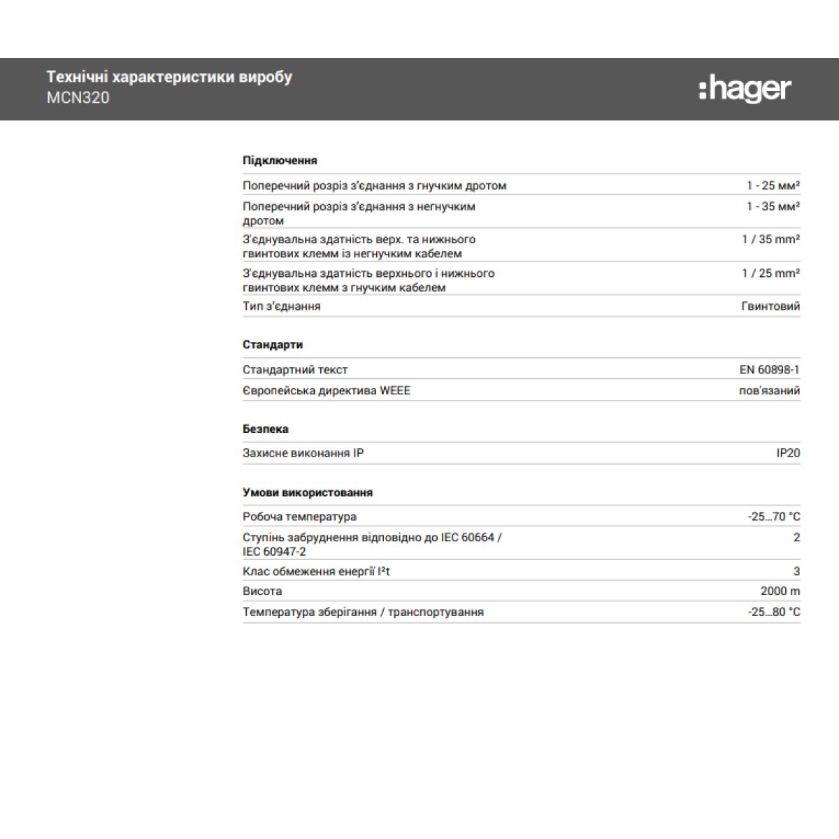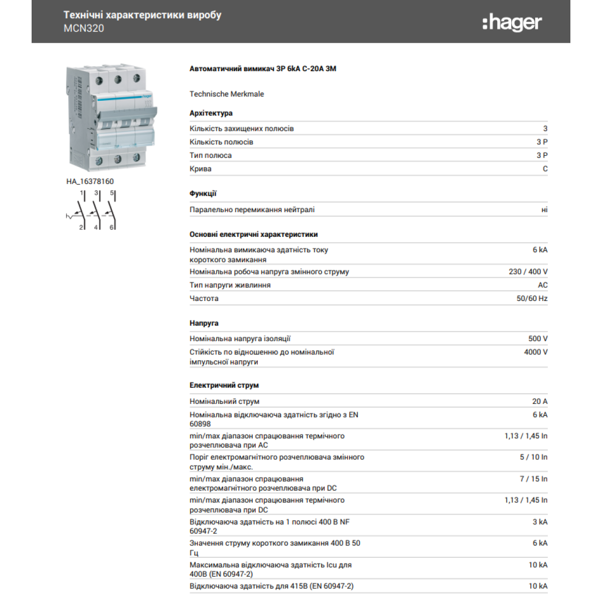 Автоматичний вимикач 6kA 3P 20A тип C, Hager MCN320