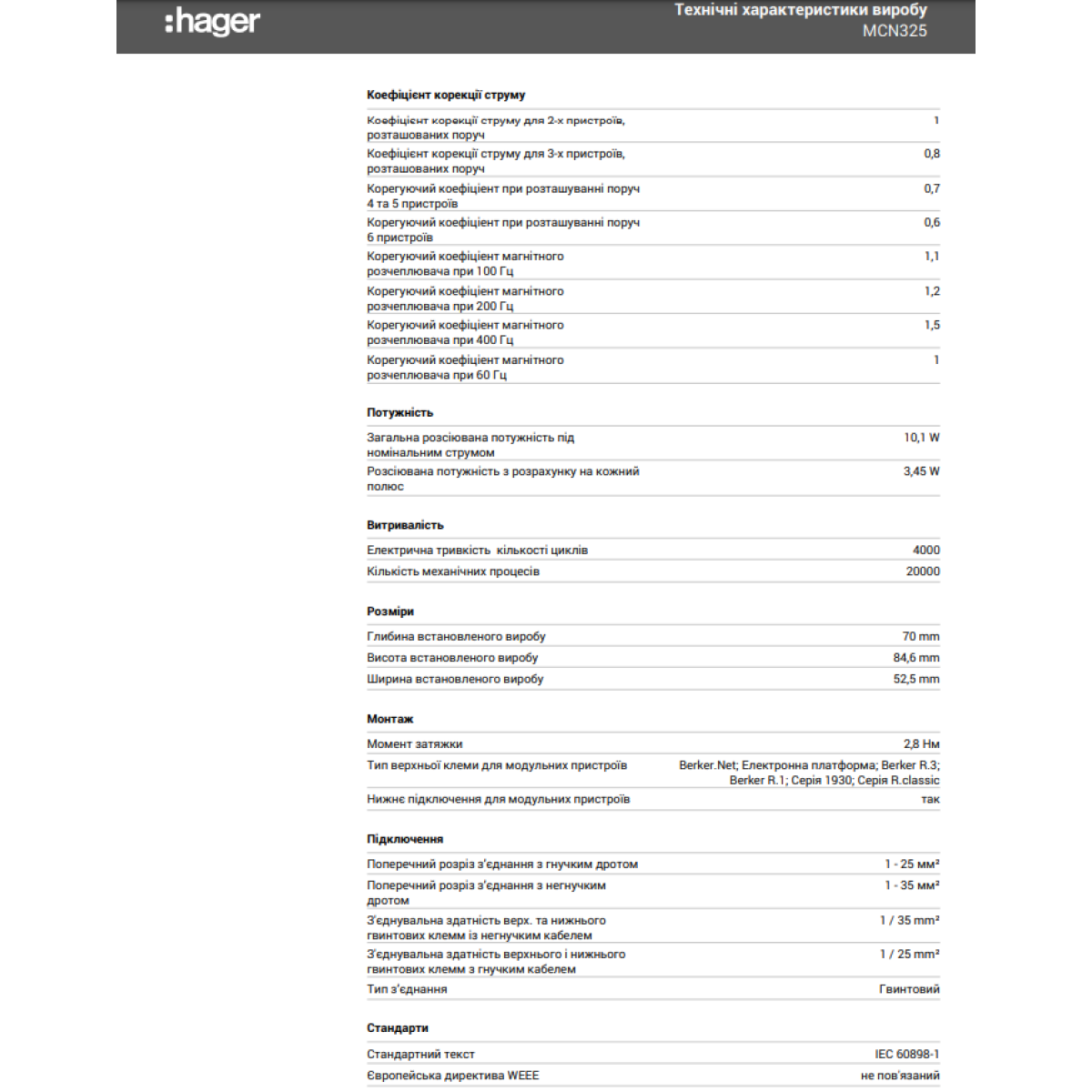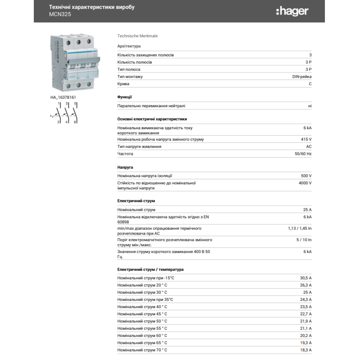 Автоматичний вимикач 6kA 3P 25A тип C, Hager MCN325
