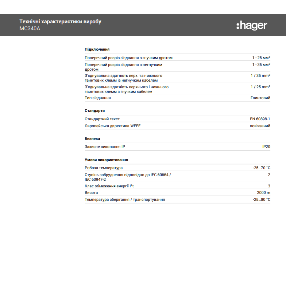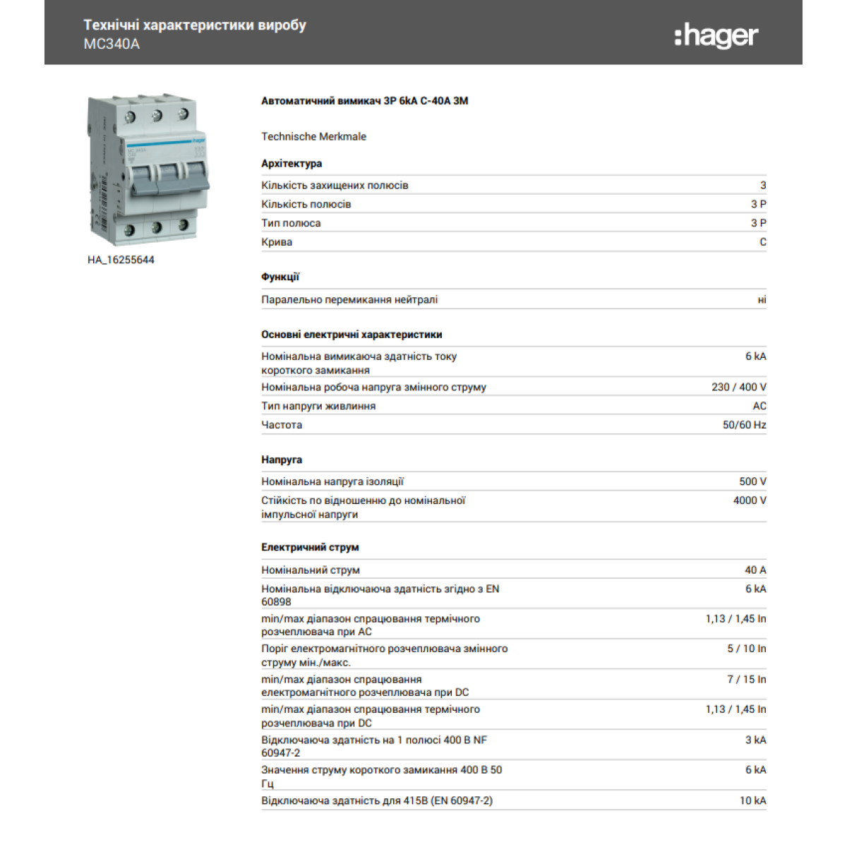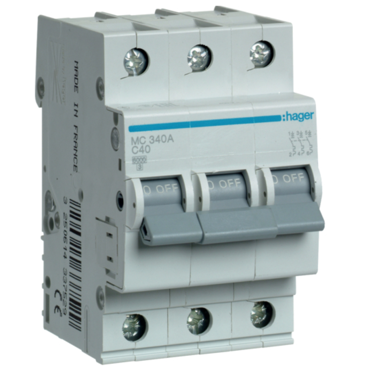 Автоматичний вимикач 6kA 3P 40A тип C, Hager MC340A