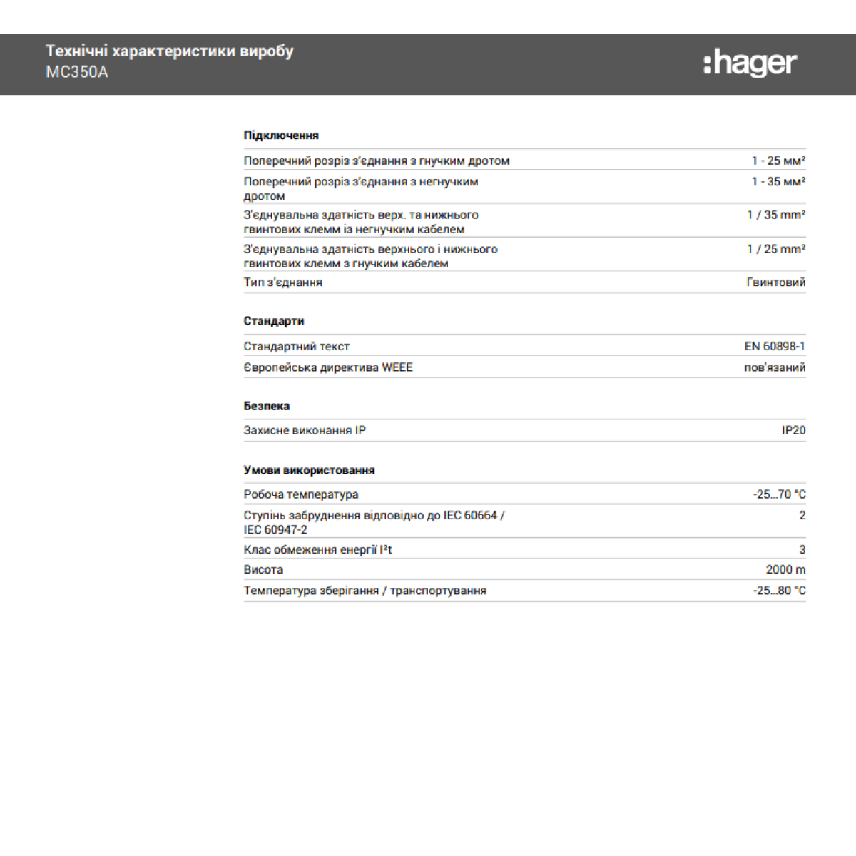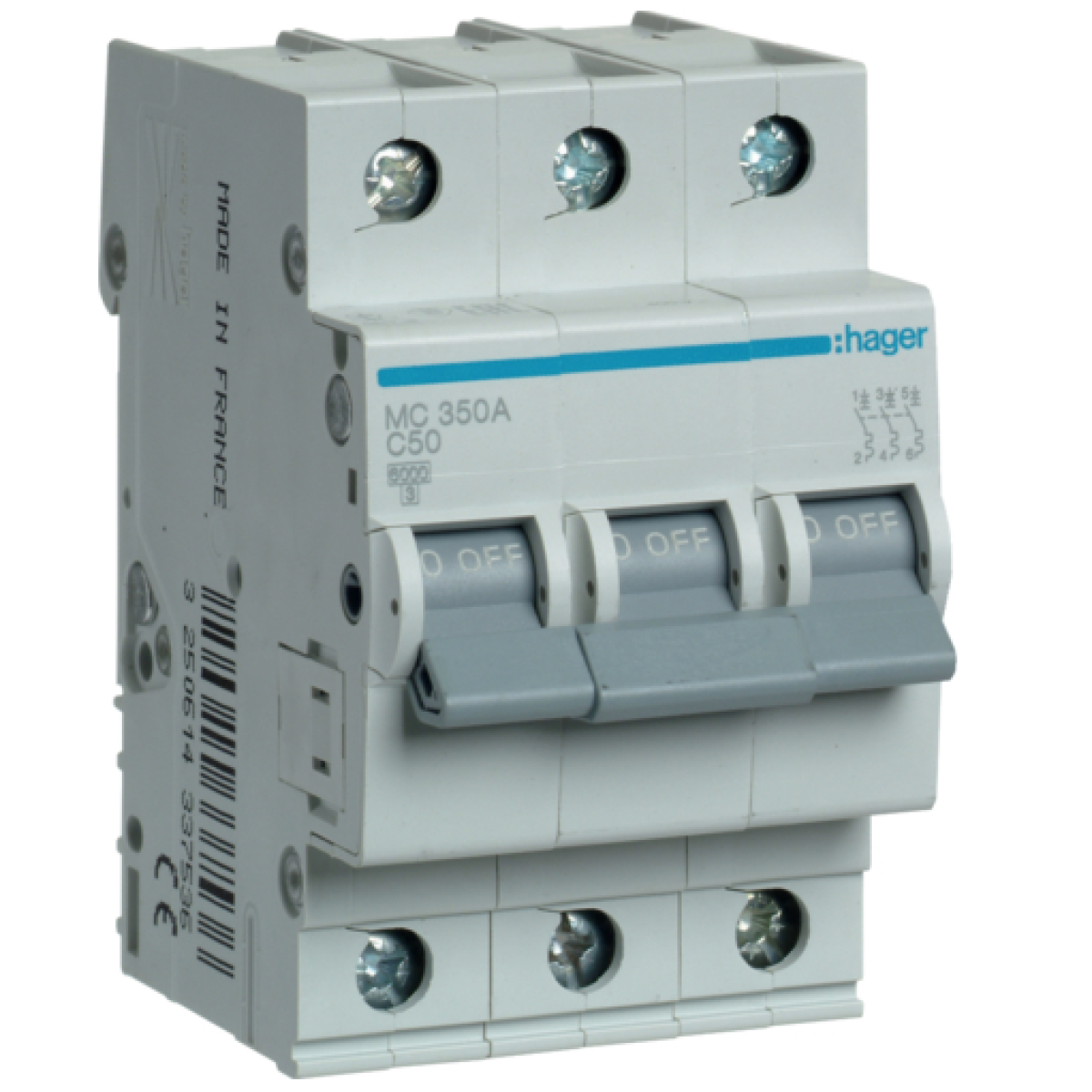 Автоматичний вимикач 6kA 3P 50A тип C, Hager MC350A