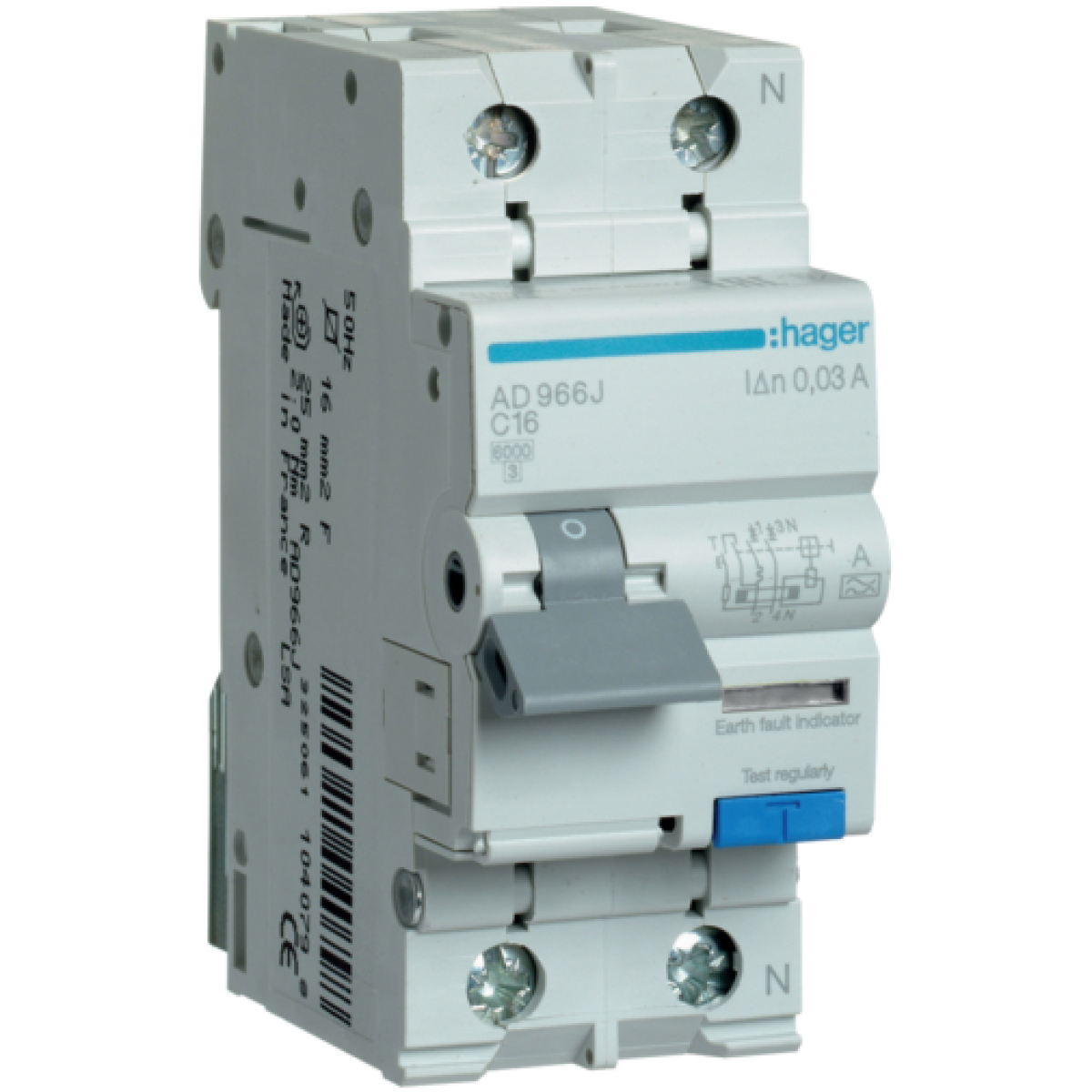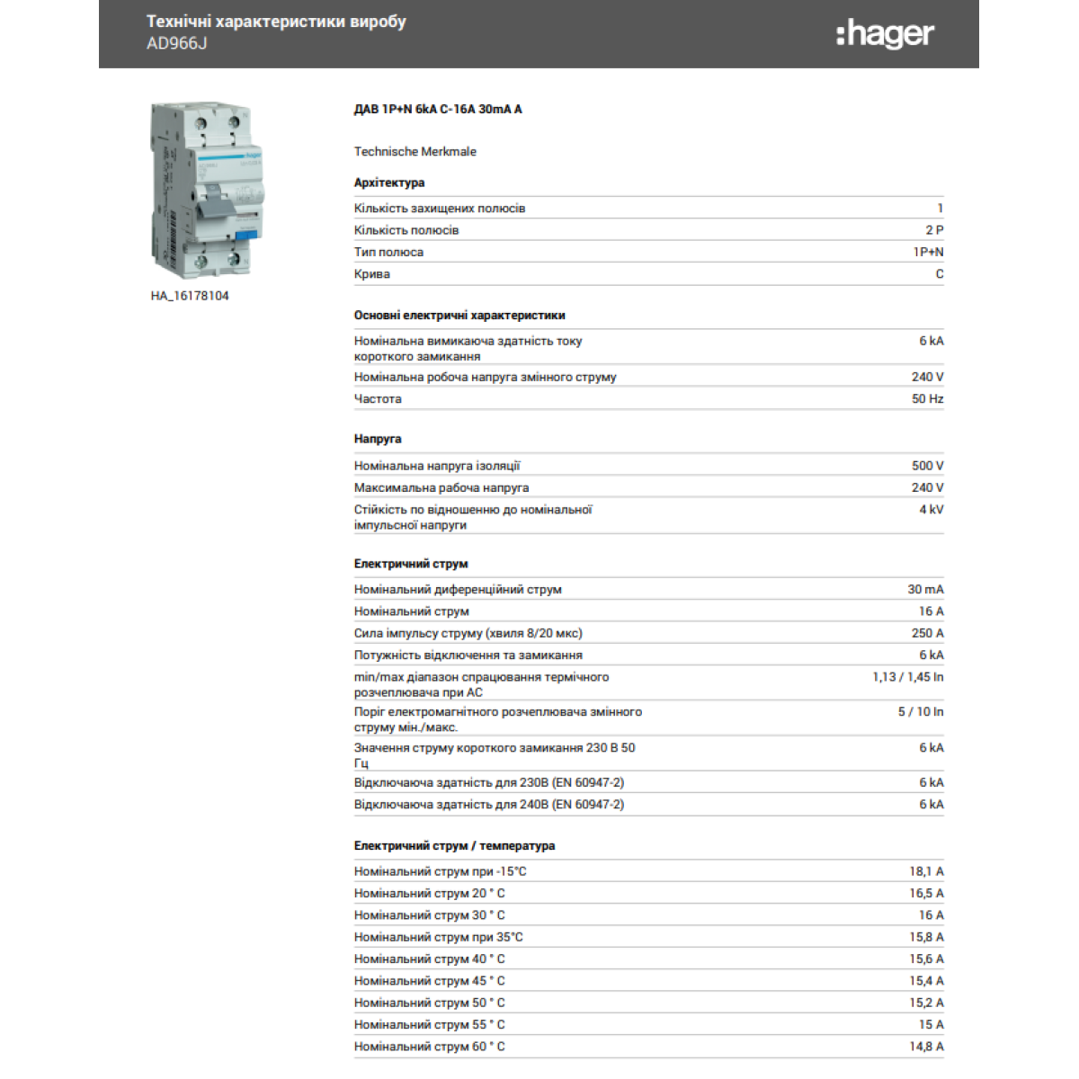 Диференційний автомат 6kA 1P+N 16A тип C 30mA А, Hager AD966J