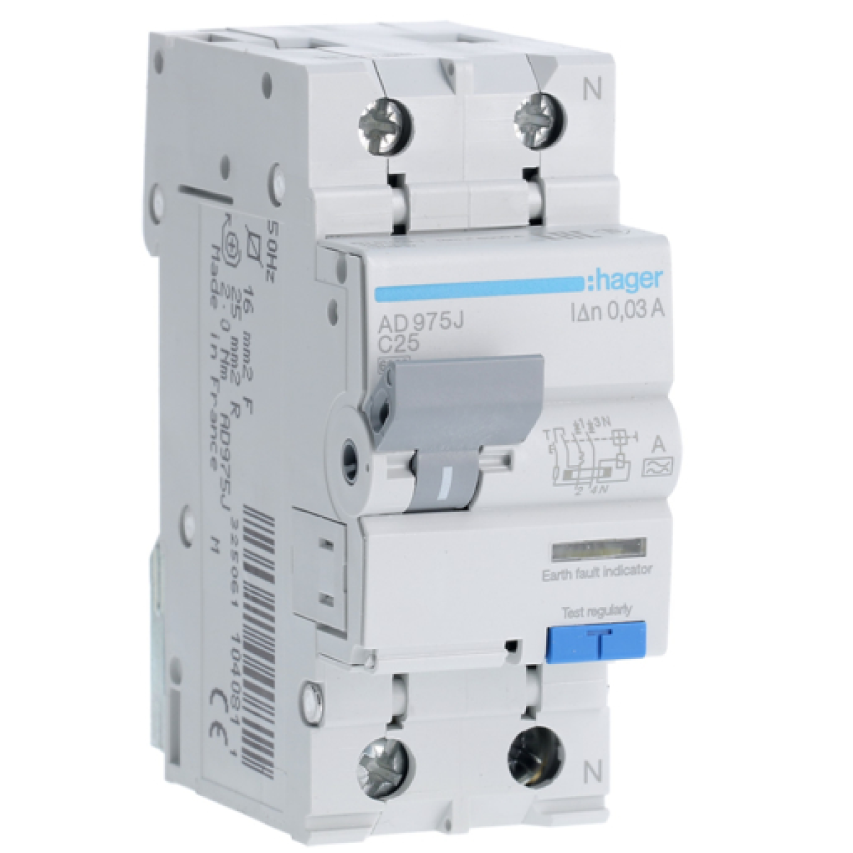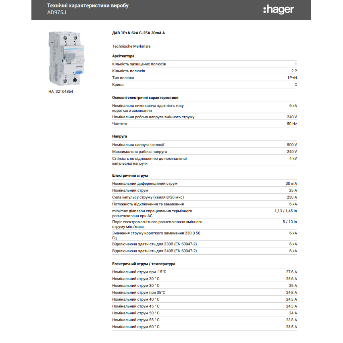 Диференційний автомат 6kA 1P+N 25A тип C 30mA А, Hager AD975J