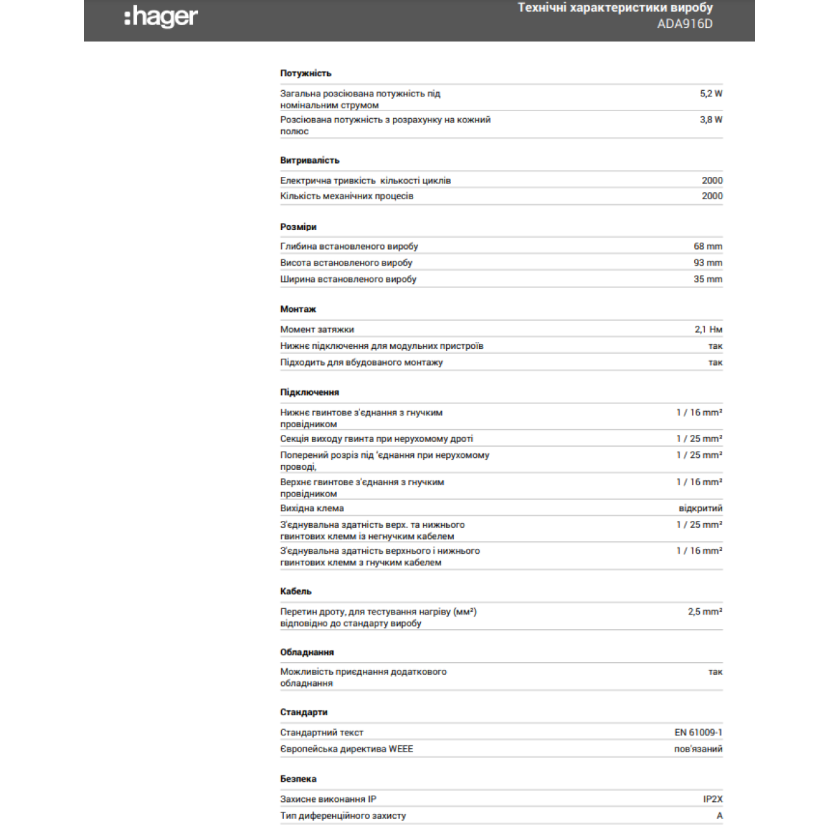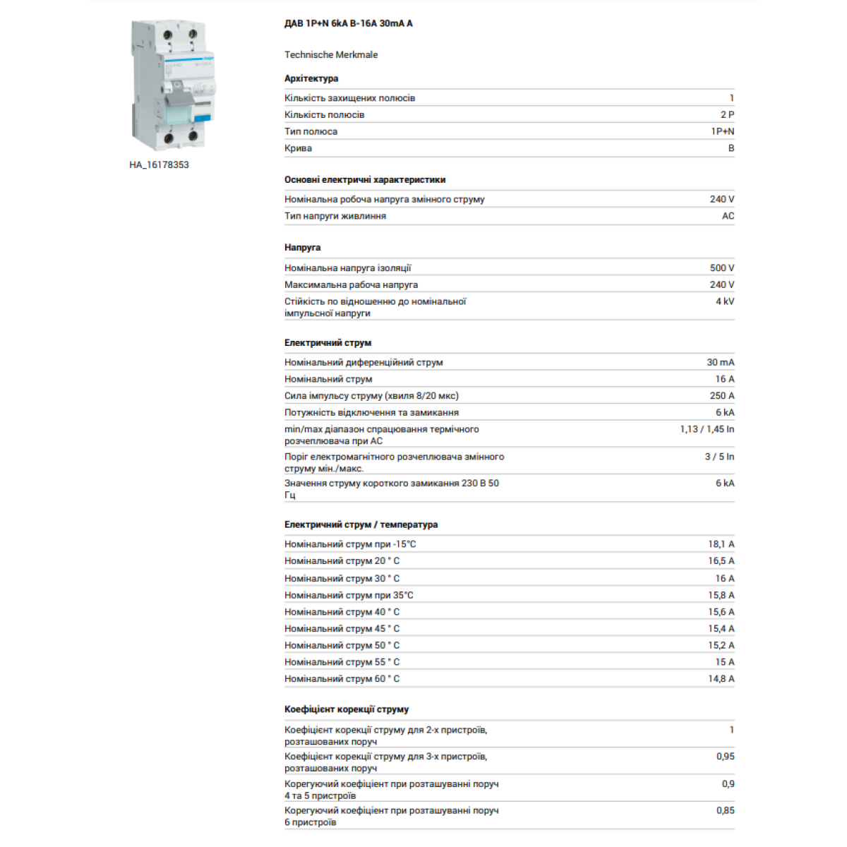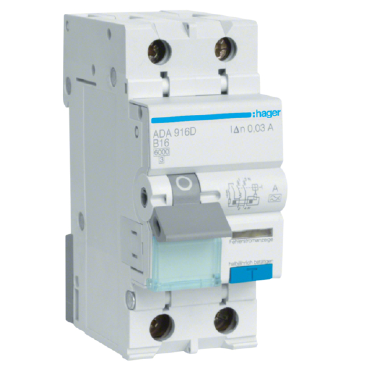 Диференційний автомат 6kA 1P+N 16A тип B 30mA А, Hager ADA916D
