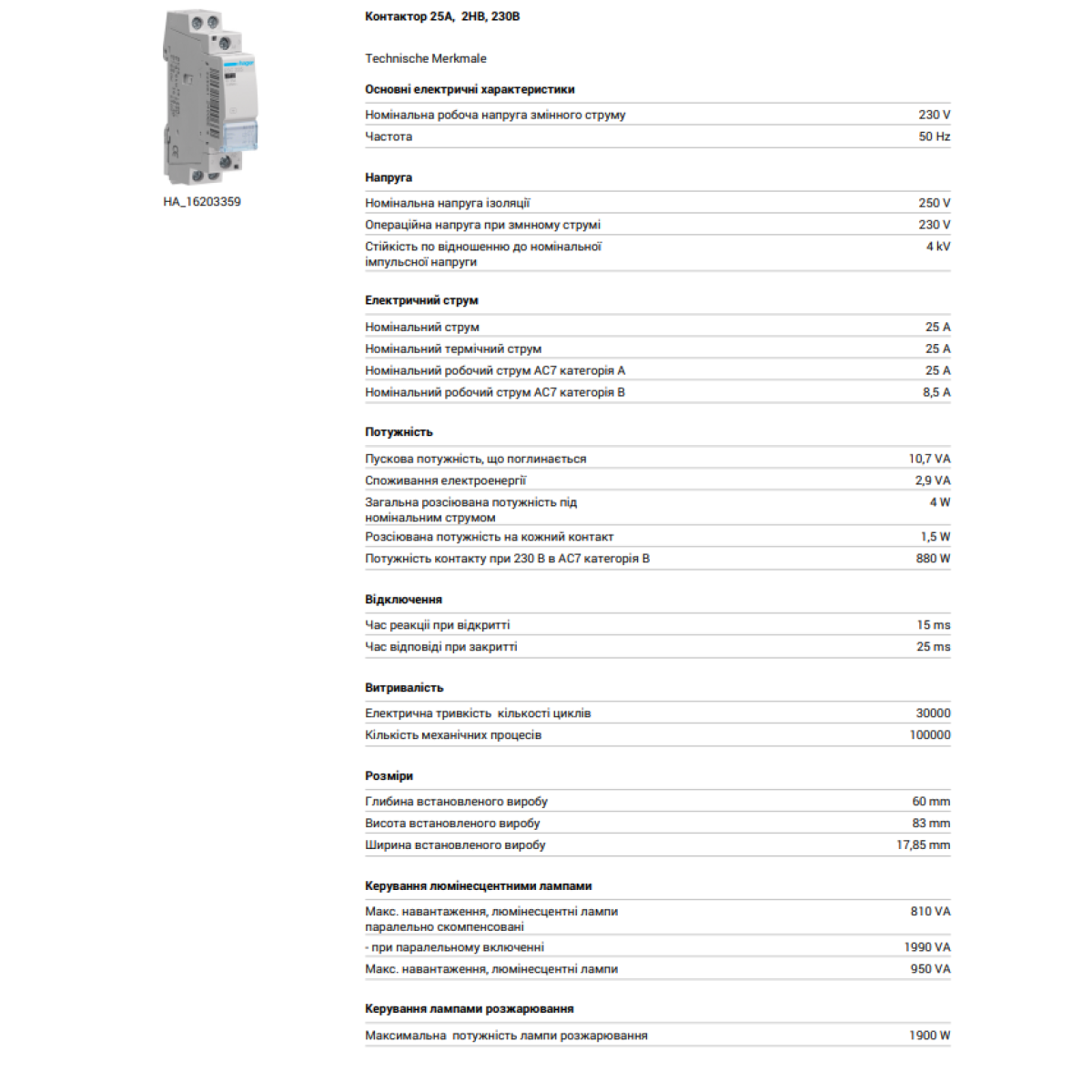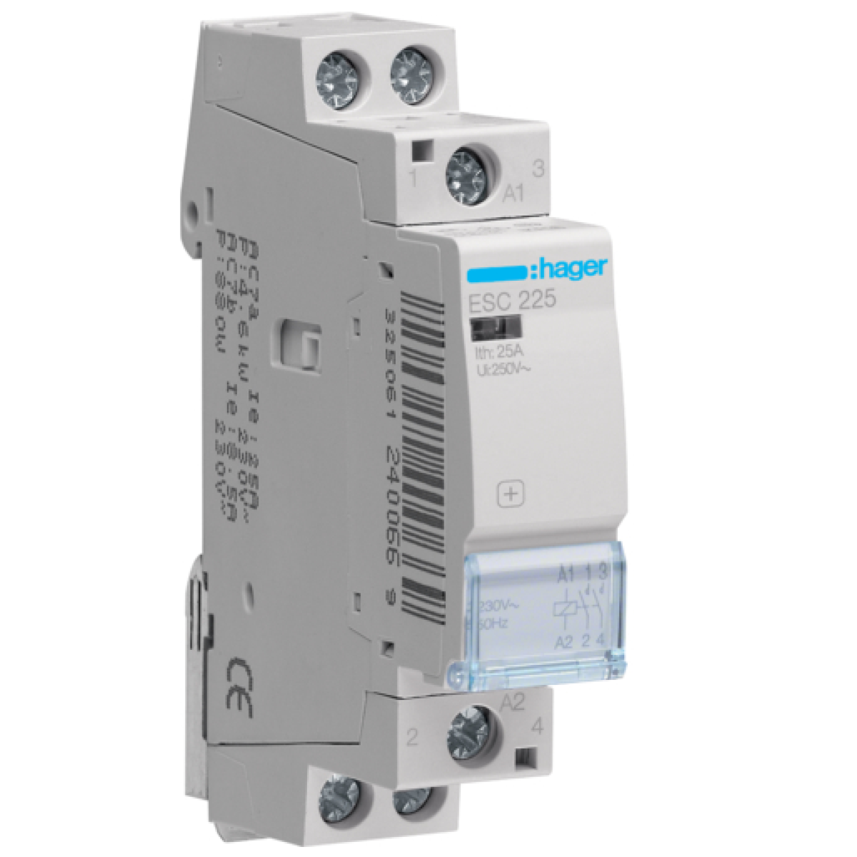 Контактор модульний ESC225 25А 230В AC 2НО, Hager призначений для комутації та керування електричними ланцюгами. Використовується для керування системами освітлення, системами вентиляції, насосами, ліфтами та іншими пристроями. Модульний контактор легко монтується на дин-рейку в розподільчому щиті.