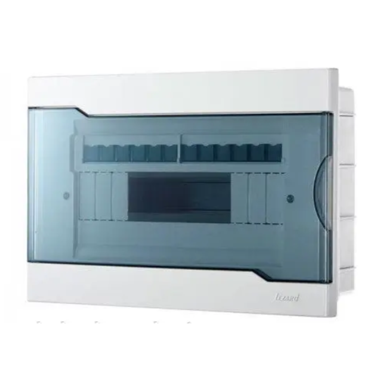 Бокс під автомат на 12 модулів від турецького бренду Lezard - призначений для захисту та керування ліній освітлення, електроприладів або частини електричного кола. Використовується у житлових, торгових, адміністративних, офісних приміщеннях. Всередину встановлюються автоматичні вимикачі на оцинковану дин рейку. Укомплектовані набором пристроїв, такі щитки захищають електричну мережу від короткого замикання та стрибків напруги. Має ступінь захисту ІР40 і може використовуватися тільки всередині приміщення. Кришка щитка для автоматів Lezard виготовляється з полікарбонату, може відкриватися з обох сторін і захищає провід та модульне обладнання від попадання пилу та вологи. Корпус виконаний з міцного АБС-пластику, а комірки для маркування з полікарбонату. Каркас досить просто та швидко монтується на поверхню, а дроти легко проводять через відверстия вгорі та внизу щита. За способом встановлення - бокс врізний. Перед вибором пристрою потрібно заздалегідь прорахувати кількість автоматів, які передбачається встановити. Даний бокс розрахований на 12 модулів. Рекомендується брати пристрій із запасом місця на DIN-рейці, якщо в майбутньому з“являтимуться нові прилади, а порожні місця поки закривати заглушками.