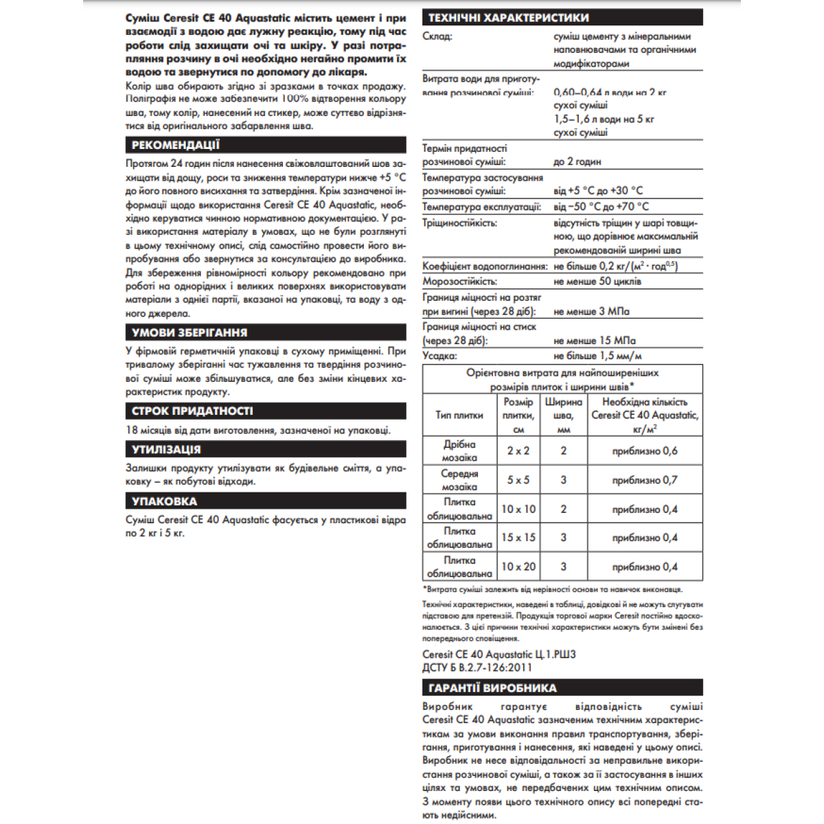 CERESIT® CE 40 Aquastatic — суха суміш з технологією SILICA ACTIVE для заповнення швів керамічних і скляних облицювань, а також зі штучного і натурального каменю, зокрема мармуру, при роботах на горизонт. і вертикал. поверхнях. Можна використовувати у місцях, які періодично або тривало зазнають інтенсивного впливу води всередині та зовні будівель. Ефективна при облицюванні основ, що зазнають деформації: підлог із підігрівом, плит OSB, ДСП та з гіпсокартону. Див. тех. опис продукту.